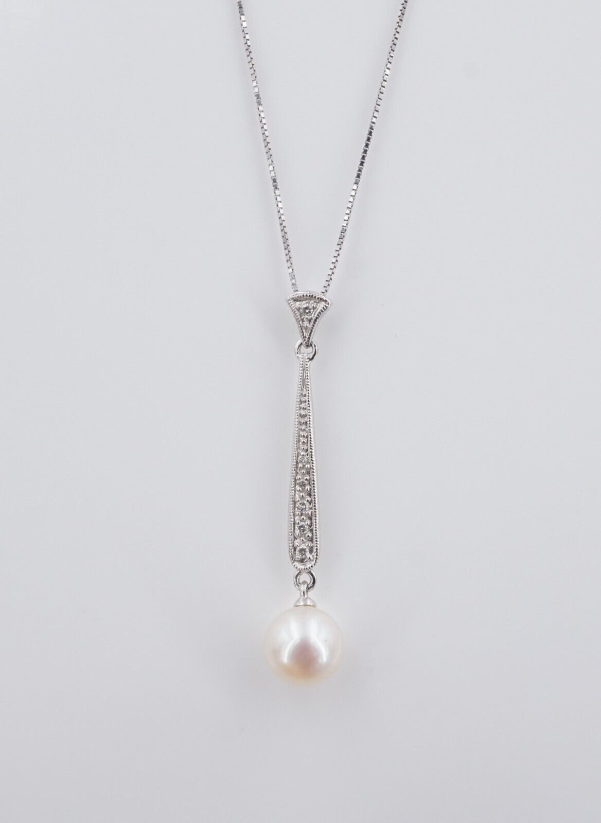 This beautiful Y-necklace features a delicate pearl with silver overtones, suspended from a diamond studded bar pendant, attached to a supple 14k white gold box chain. Milgrain details adds depth to the piece. A lovely accessory that is sure to be an instant favorite!