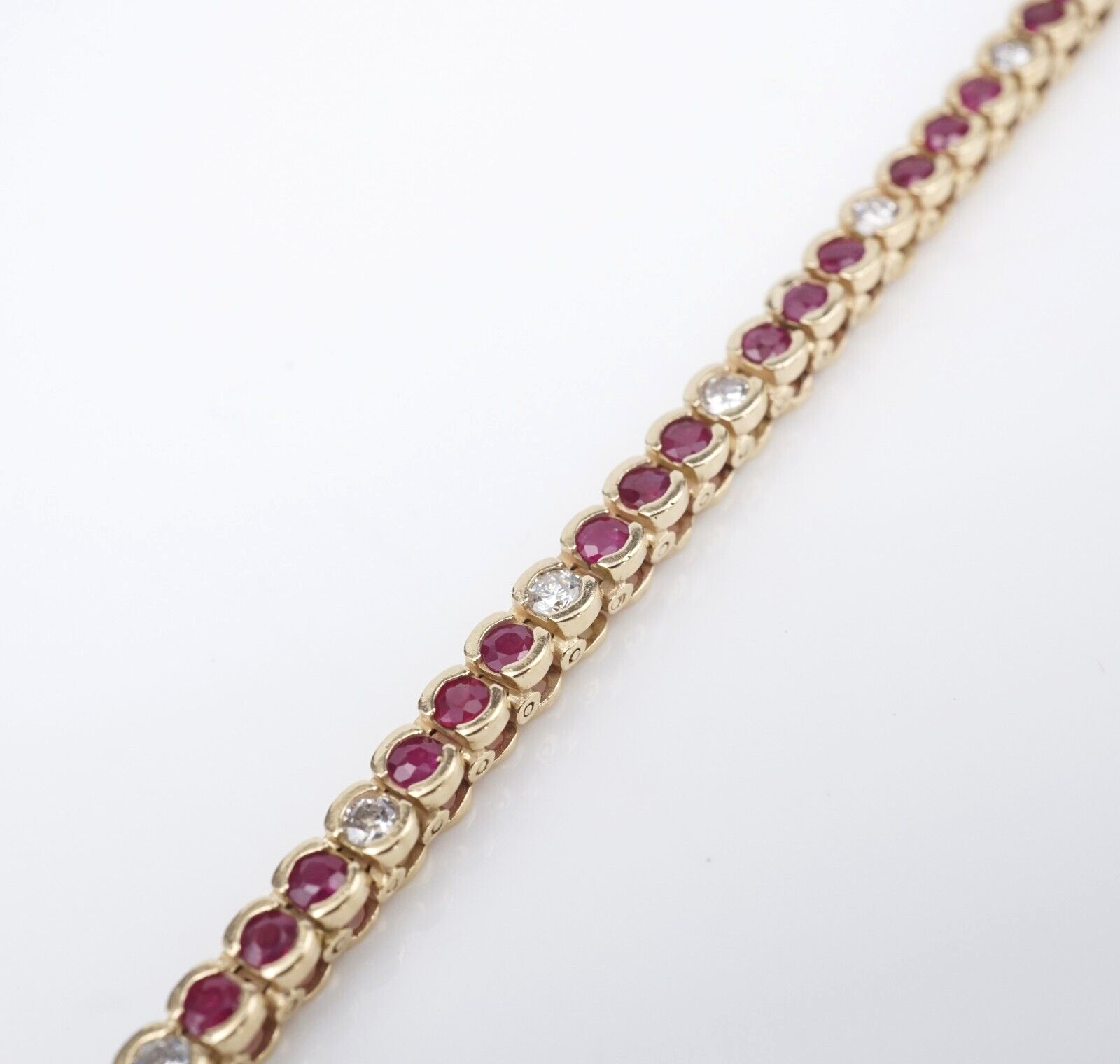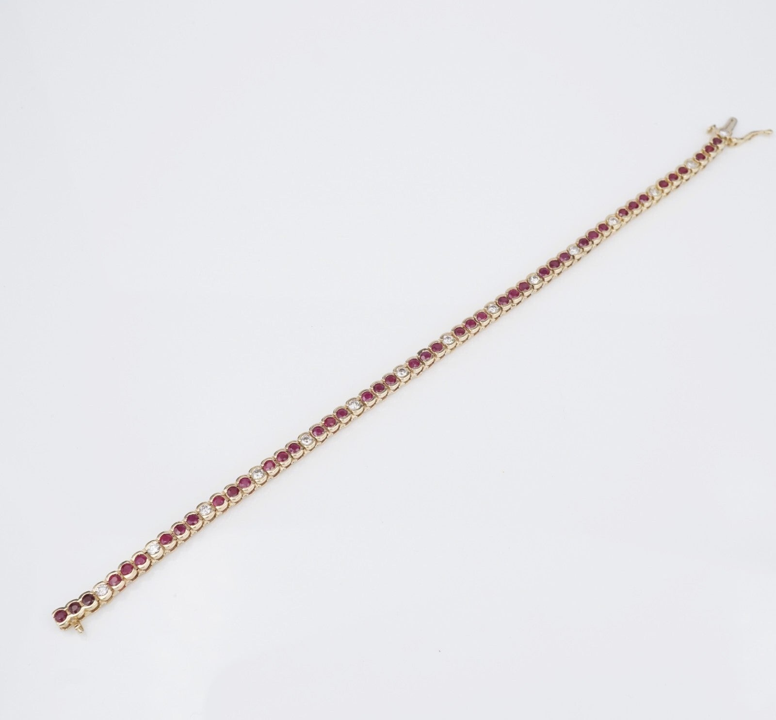 Measurements: 7.5" long by 4 mm wide; Rubies: 45 round cut = approx. 3.6 carats; Diamonds: 15 round cut = approx. 1 carats; 13.6 grams