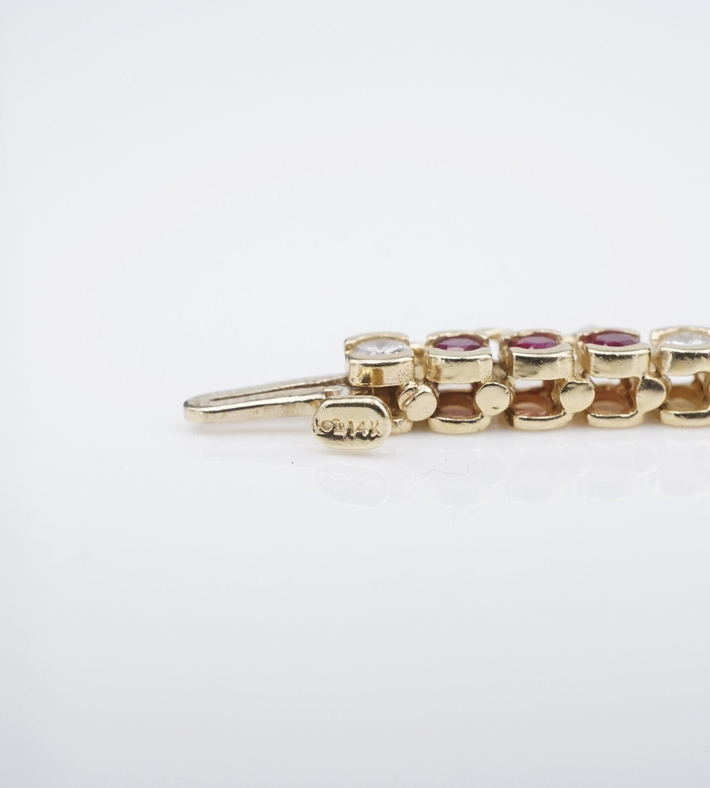 This gorgeous bracelet is a timeless treasure, with beautiful natural rubies and sparkling white diamonds, all set in solid 14sk yellow gold. The gems are arranged in groups of 3 rubies to 1 diamond to provide a striking color-blocked design. The bracelet fastens securely with an insert clasp and additional safety clip. This statement piece would make an exquisite addition to any vintage collection!