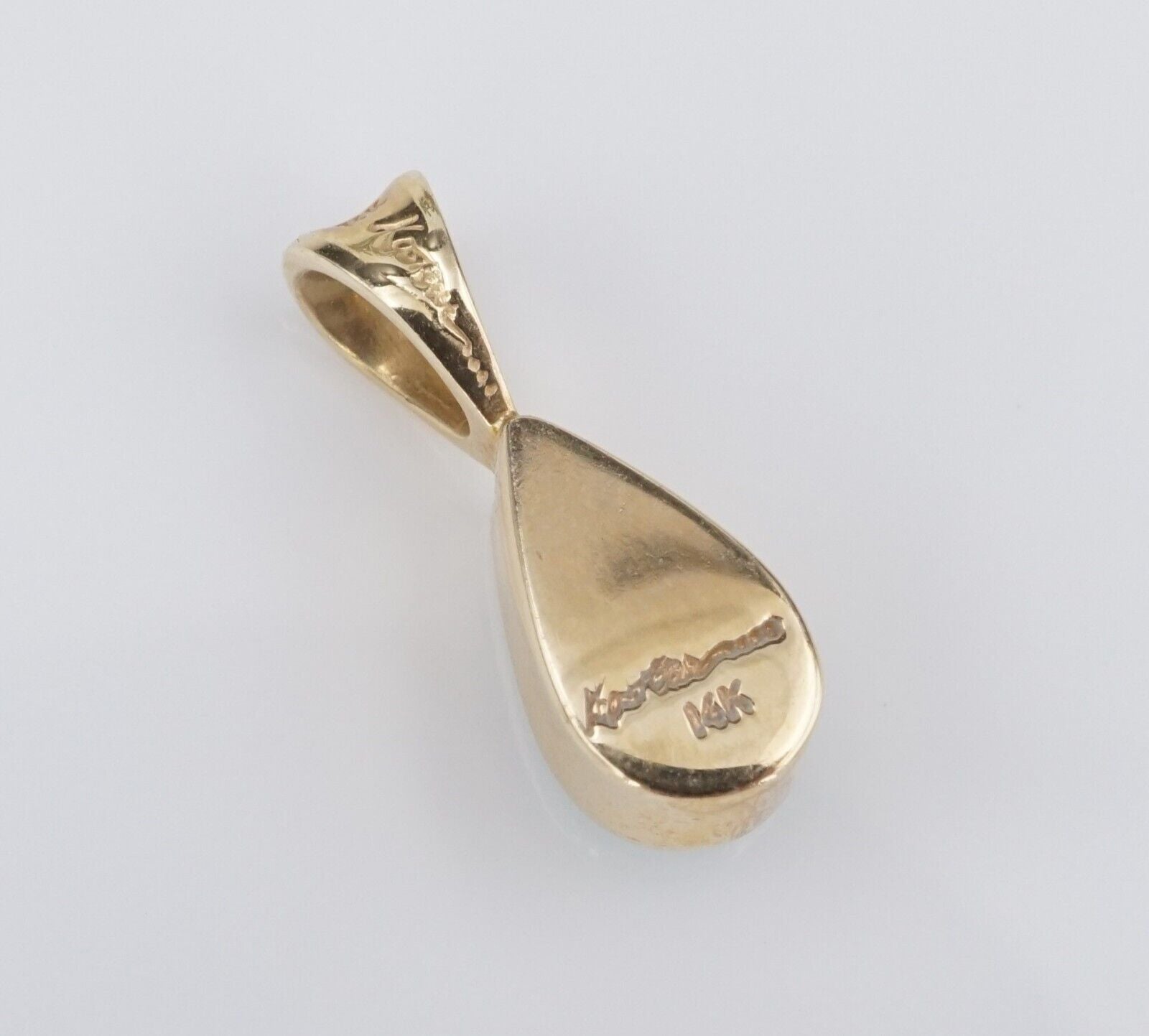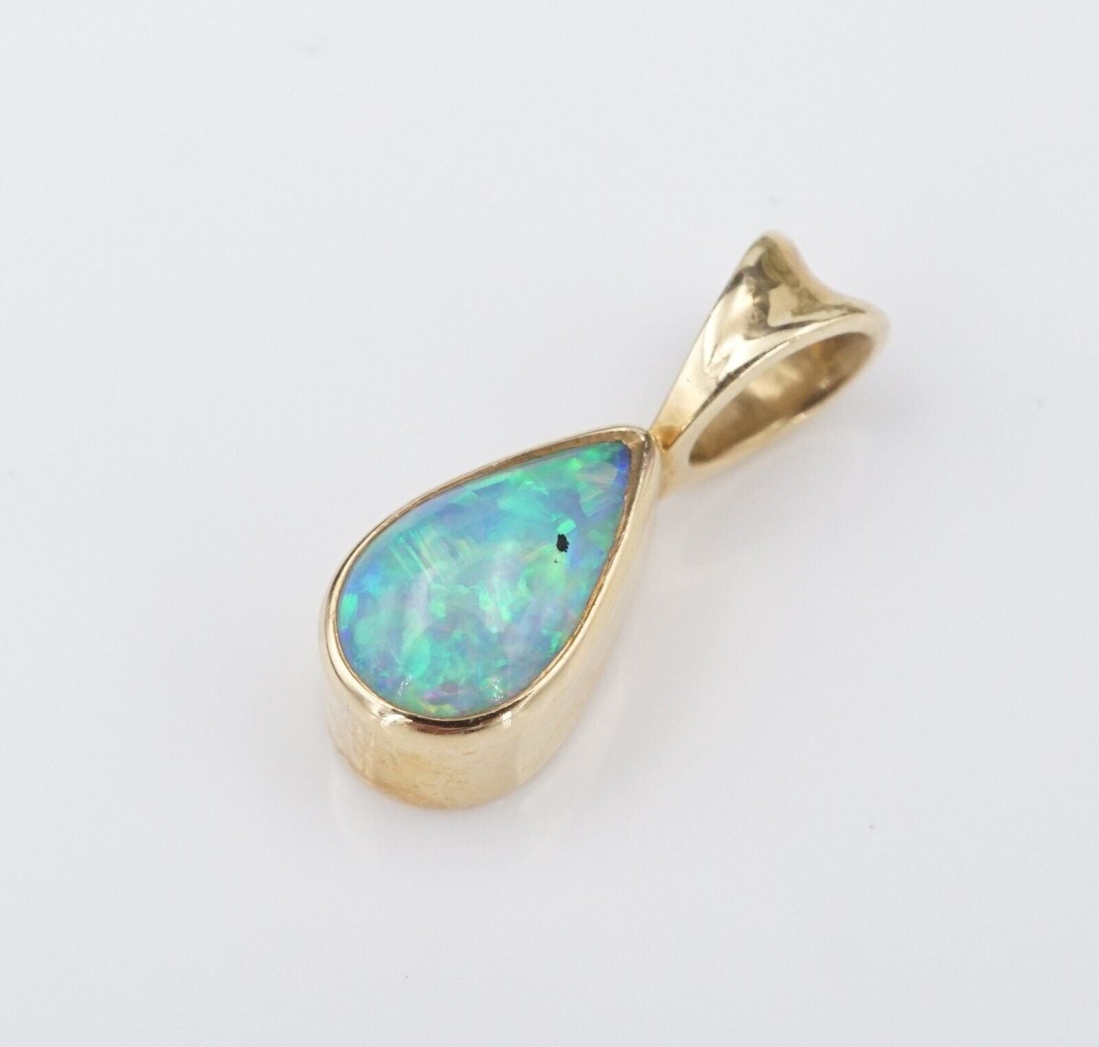 This beautiful statement pendant features a teardrop opal cabochon displaying flashes of green, blue, and red, framed in polished 14k yellow gold. A timeless classic for yourself or someone you love!