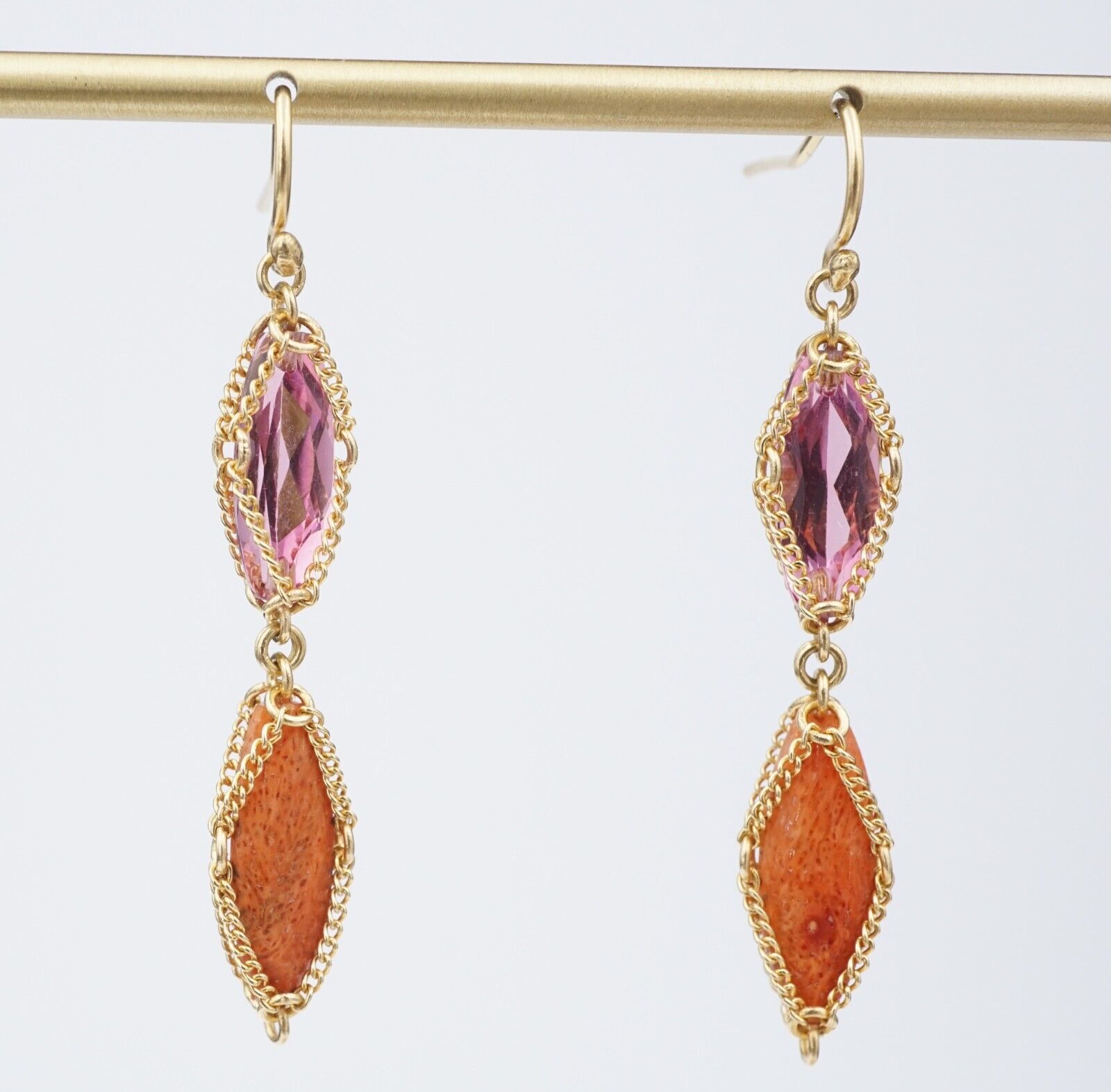 This amazing pair of earrings feature articulated drops of carved coral and faceted pink tourmaline, both wrapped in 18k yellow gold chain. These earrings secure with original hooks for pierced ears. A piece of true vintage elegance!