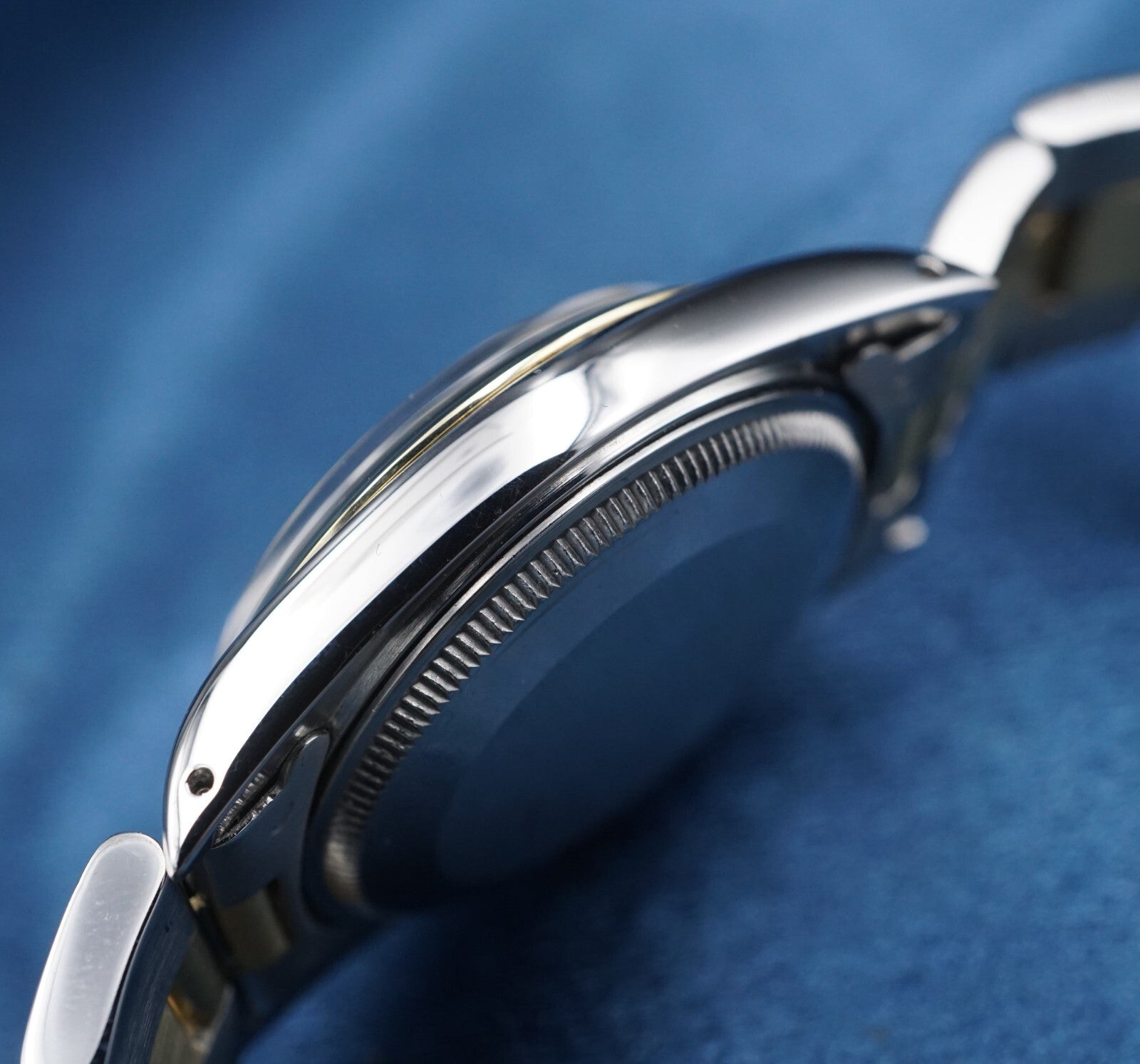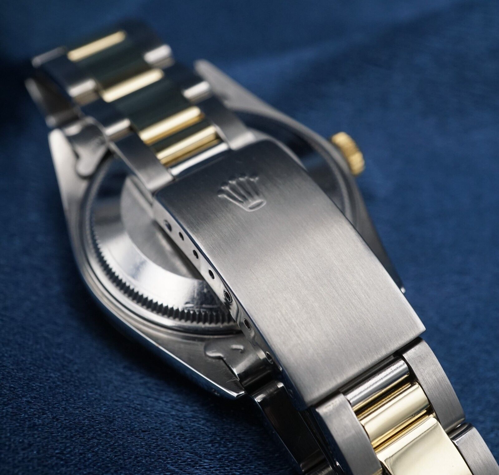 Guaranteed authentic Rolex Datejust model 15053. This classic watch features a solid stainless-steel case, smooth 14k gold bezel, 2-tone oyster bracelet, 18k crown, acrylic crystal with date bubble, and white dial with Roman numerals.