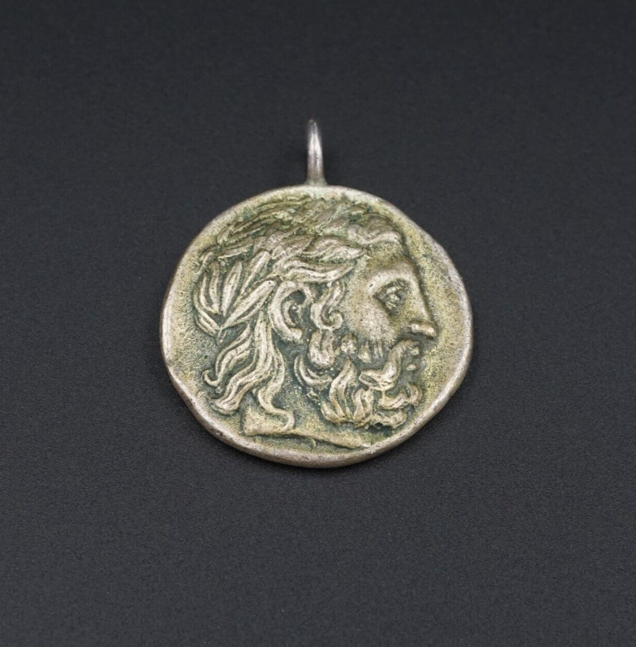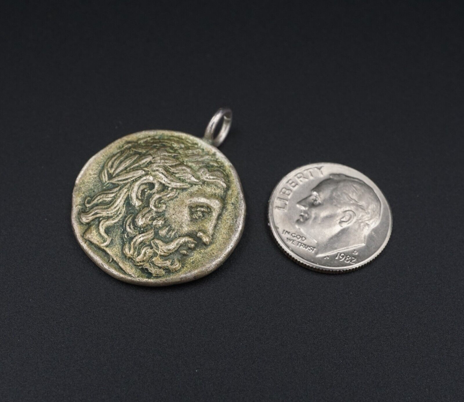 This amazing pendant features a replica of a silver Alexander the Great coin, topped with a slim bale. A handsome piece ready to add to a chain or cord of your choosing.