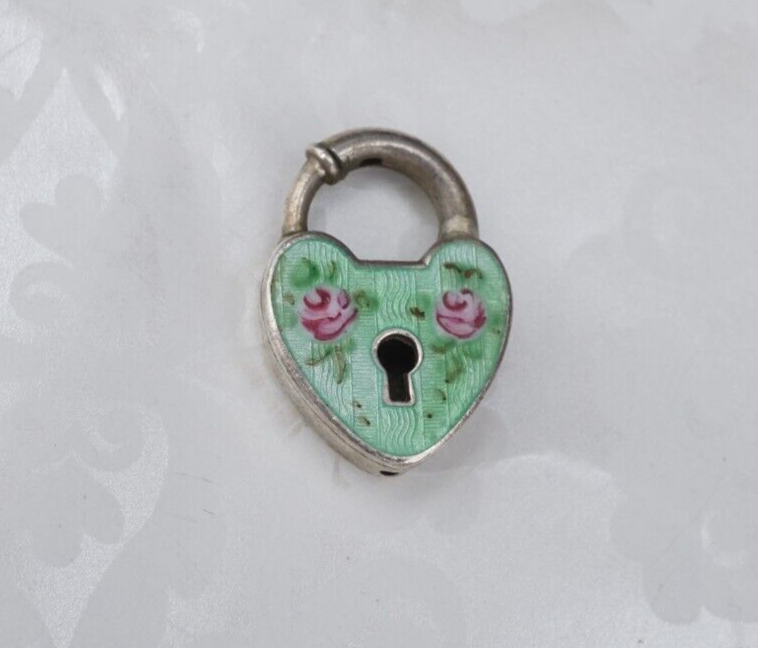 This antique heart lock charm features a green enamel set with pink enamel roses. A perfect addition to your vintage jewlery collection!