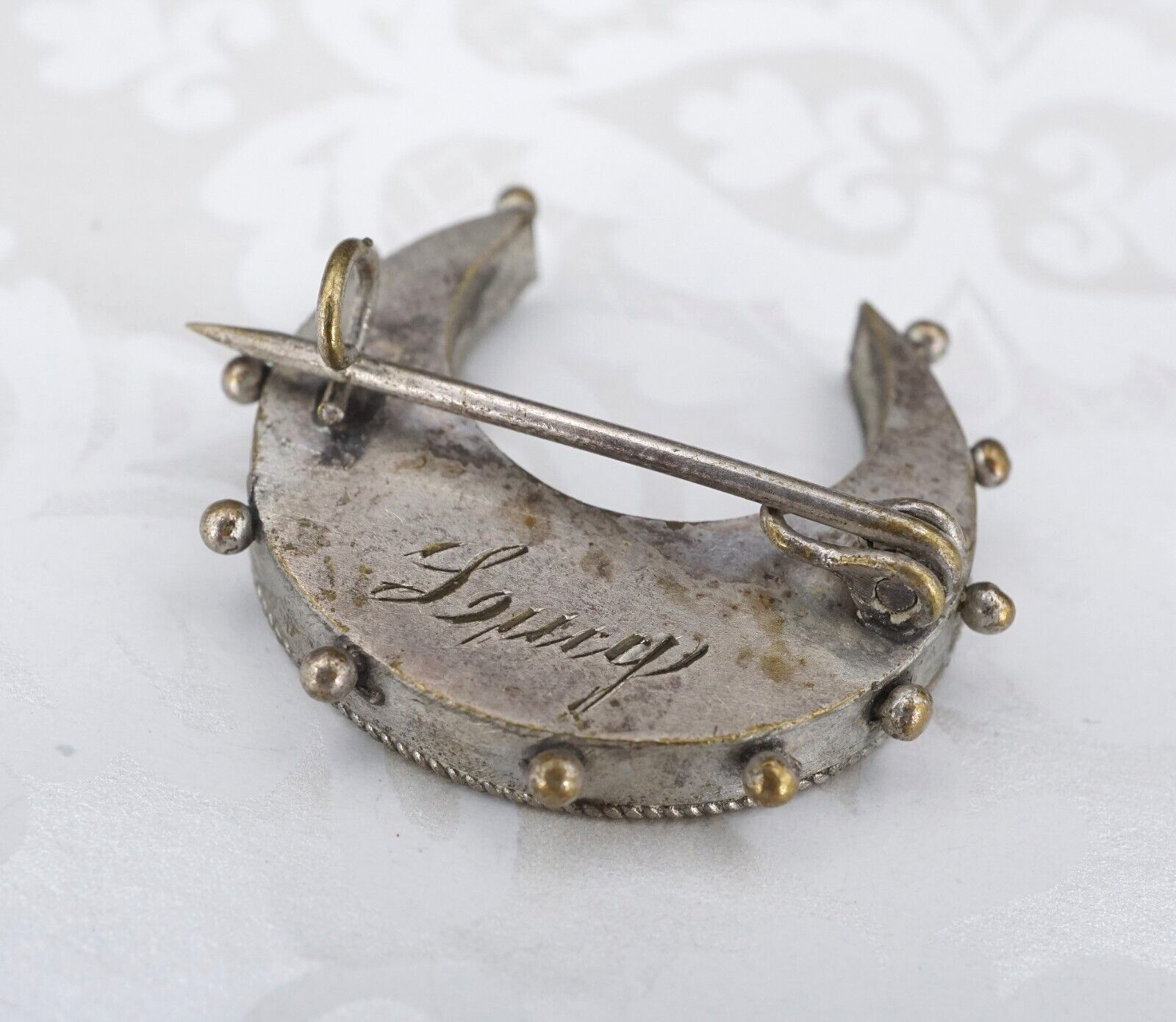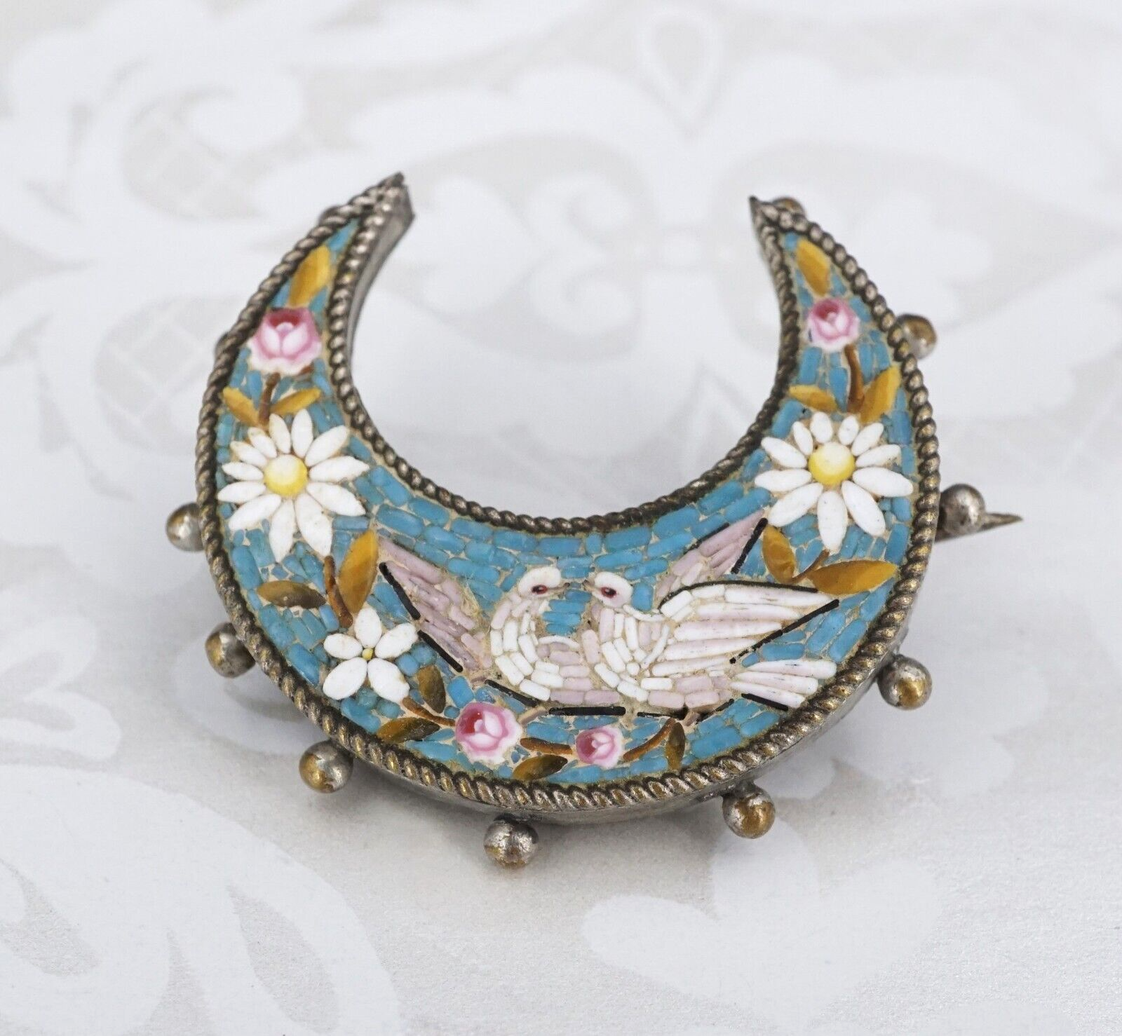 Antique Micro Mosaic Inlay Dove & Floral Crescent Brooch OS649