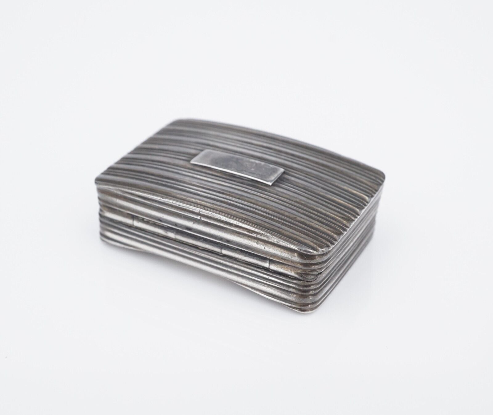 This rare ornate silver box was hand crafted in 1815 Birmingham. The entire case is full of detail, from the striped etching in the outside of the box, to the floral scroll screen inside. The inside of the case is finished in 18k gold to prevent the fragrance from reacting with the silver. This antique vinaigrette box is complete with the original sponge. All original and in amazing condition. A very rare find.
