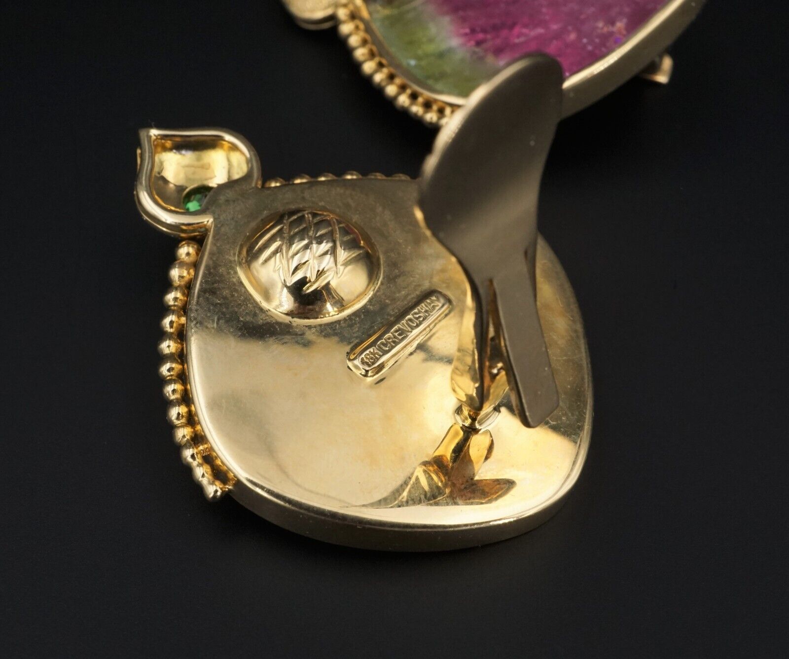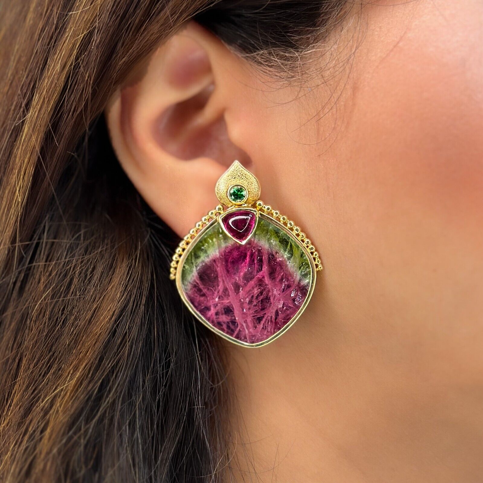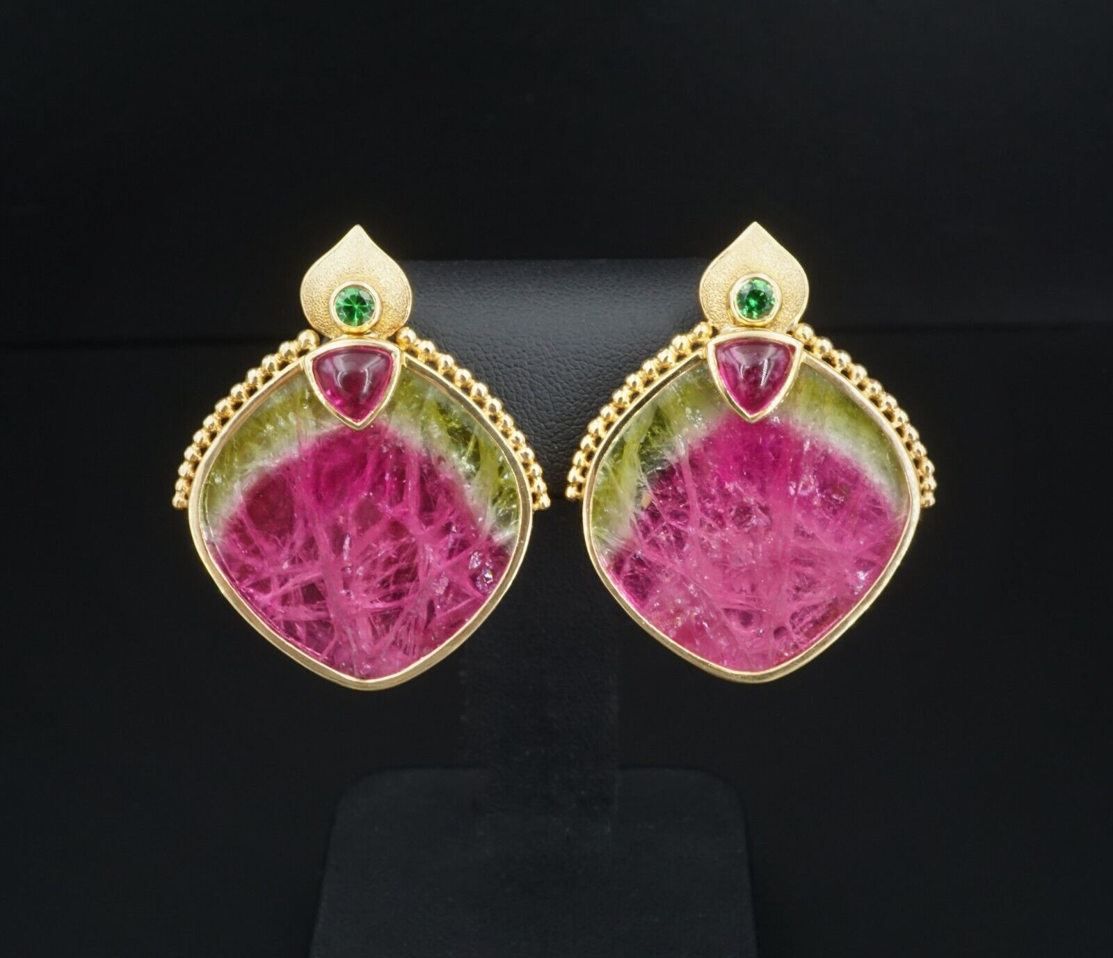 Created by award winning jeweler Paula Crevoshay, these amazing artisan clip earrings are crafted of solid 18k yellow gold and feature gorgeous natural watermelon tourmaline gemstones accented with faceted pink and green tourmaline above each.