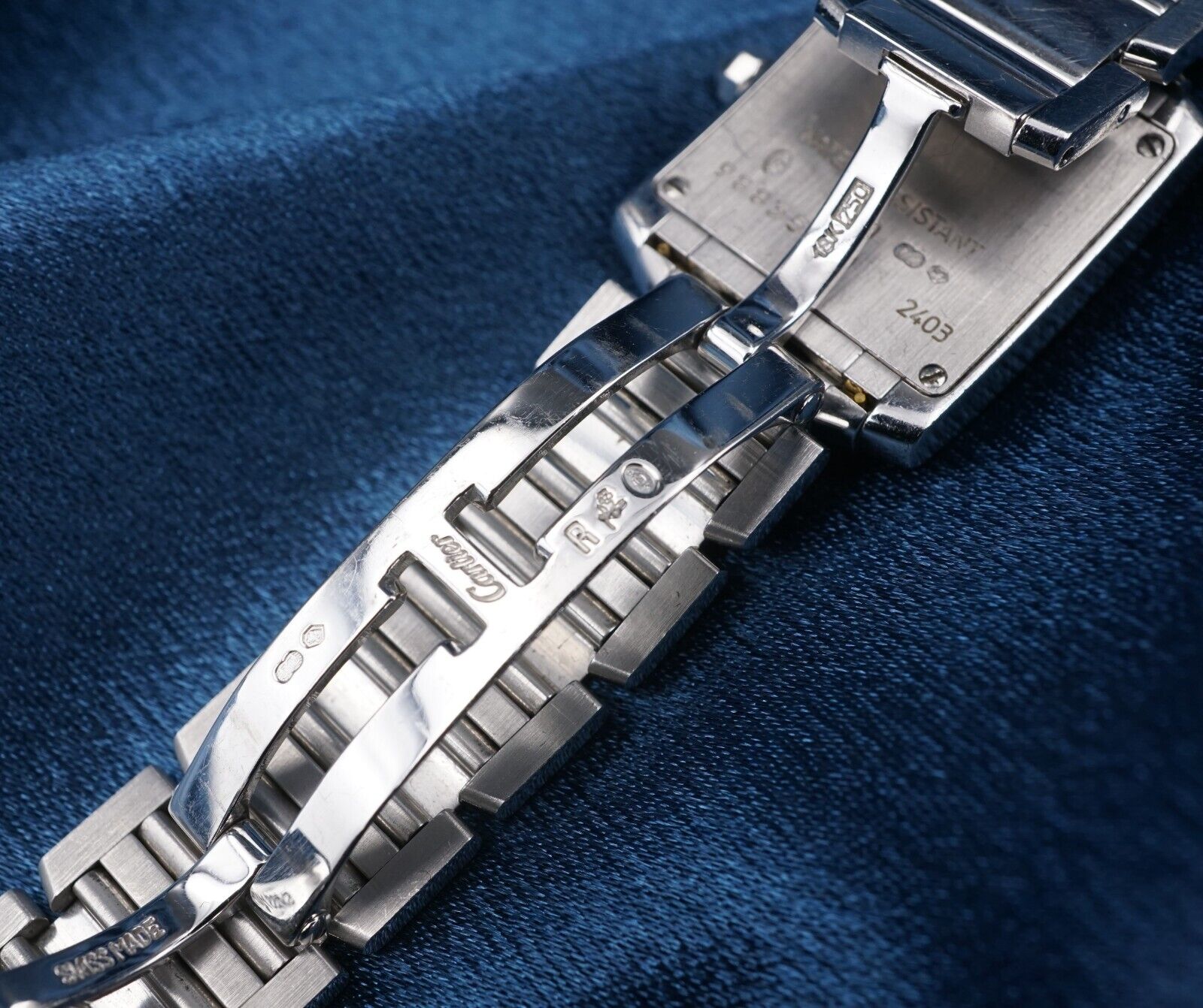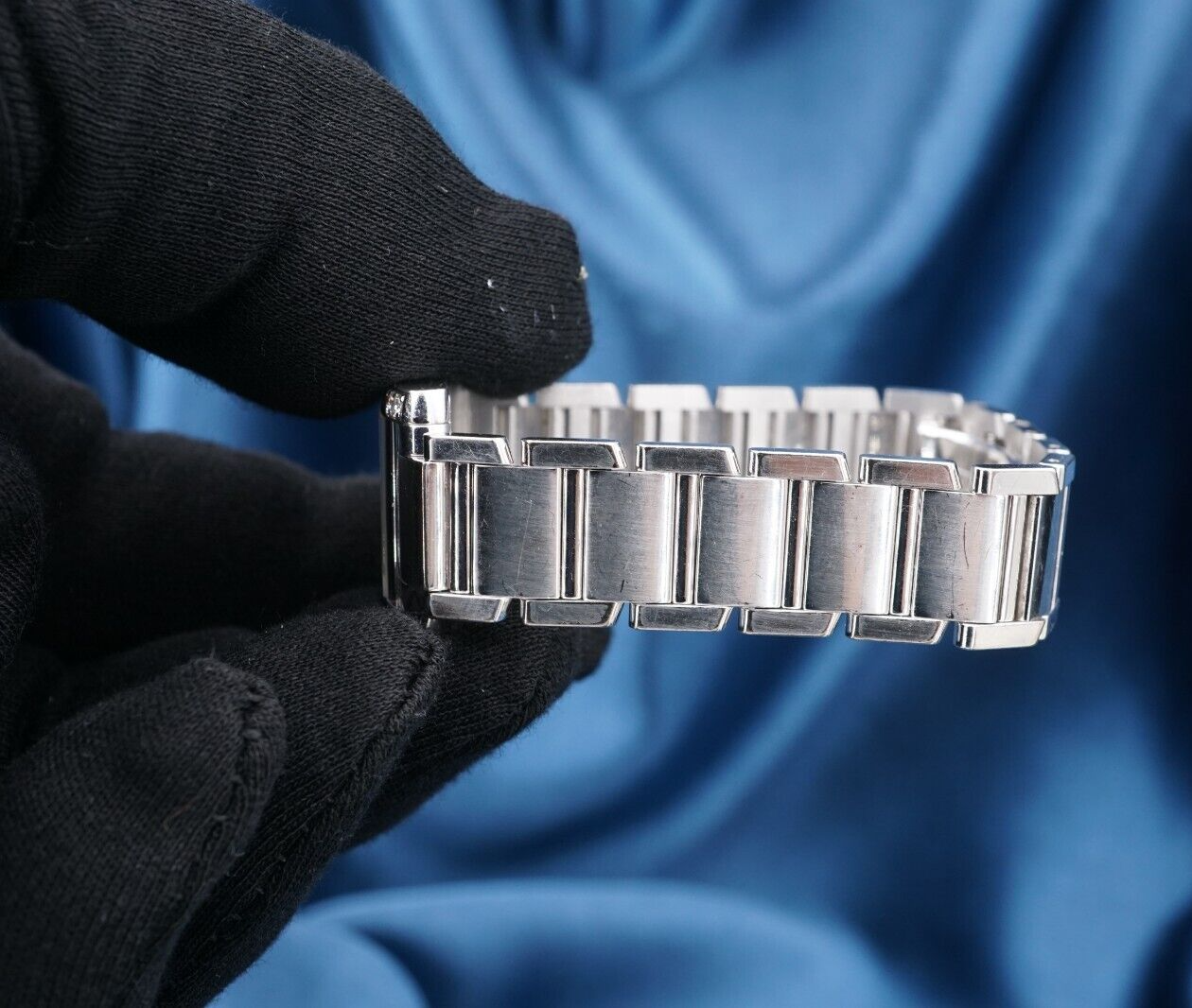 This Cartier Tank features a 20mm case, Roman numerals, sapphire crystal, diamond bezel, and white dial with steel blue hands. The crown is set with a diamond. The 18k white gold link bracelet features multiple removable links to achieve the perfect fit. Quartz movement.