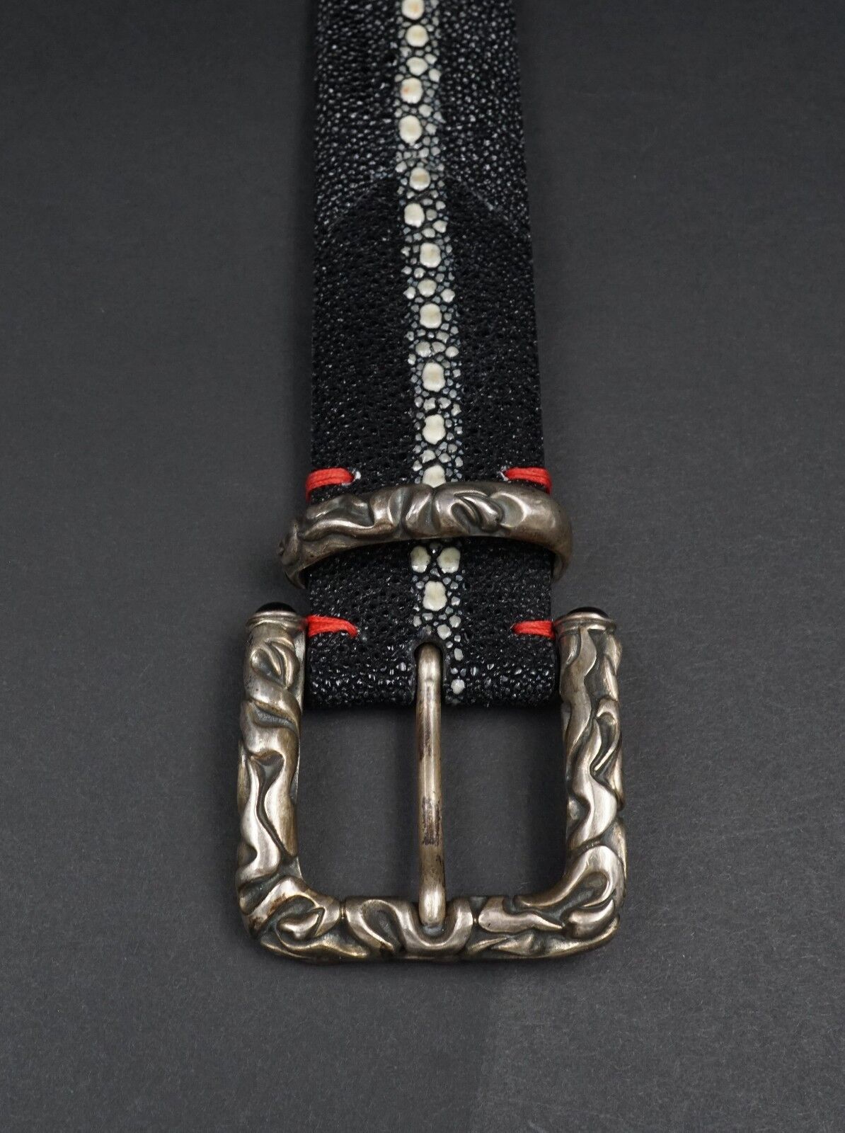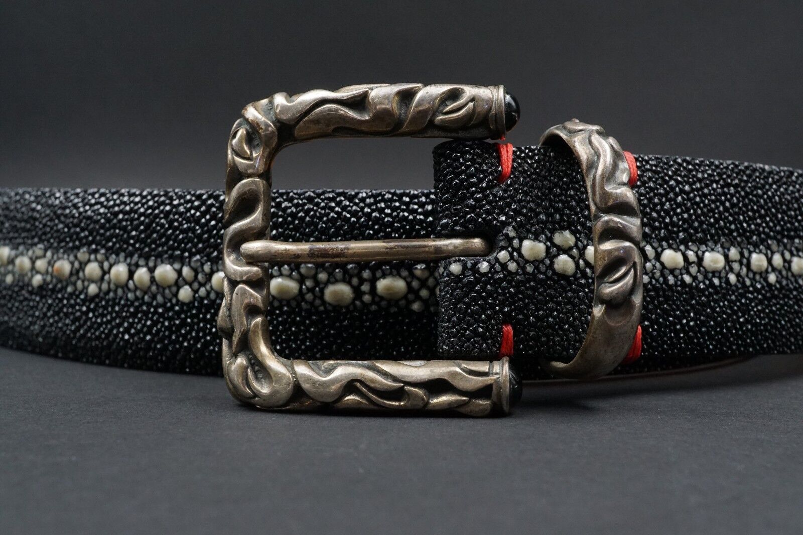 An amazingly rare belt from designer Claudio Calestani for fashion consultant for the ultra rich, Janet Brown. This stunning white and back galuchat leather belt with hand crafted sterling silver buckle and hand stitched red accents. The buckle is adorned with garnet cabochons, and has no equal. For those that know ultra fashion this belt is where it's at.