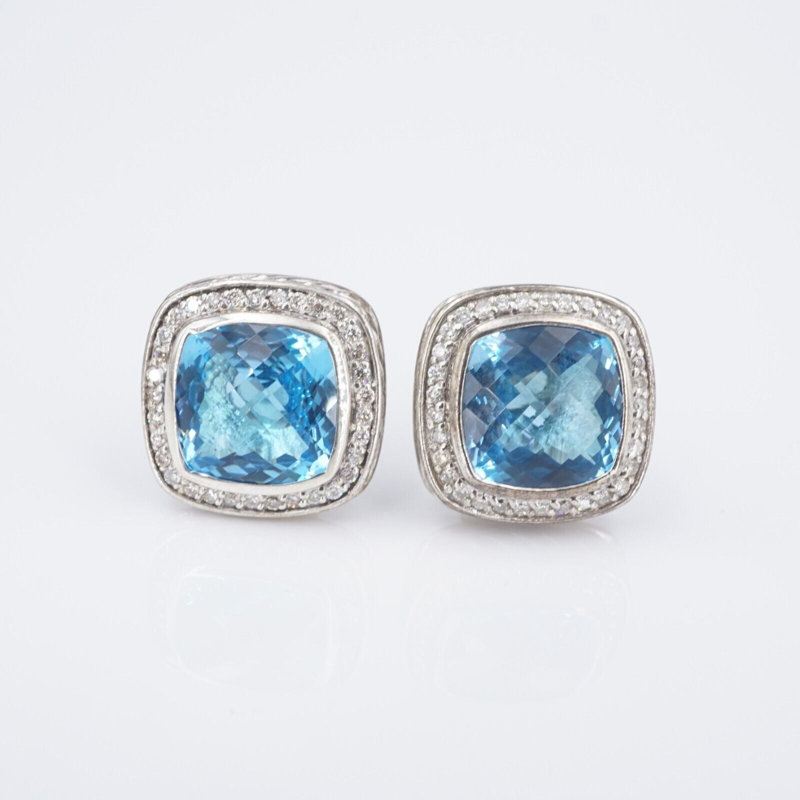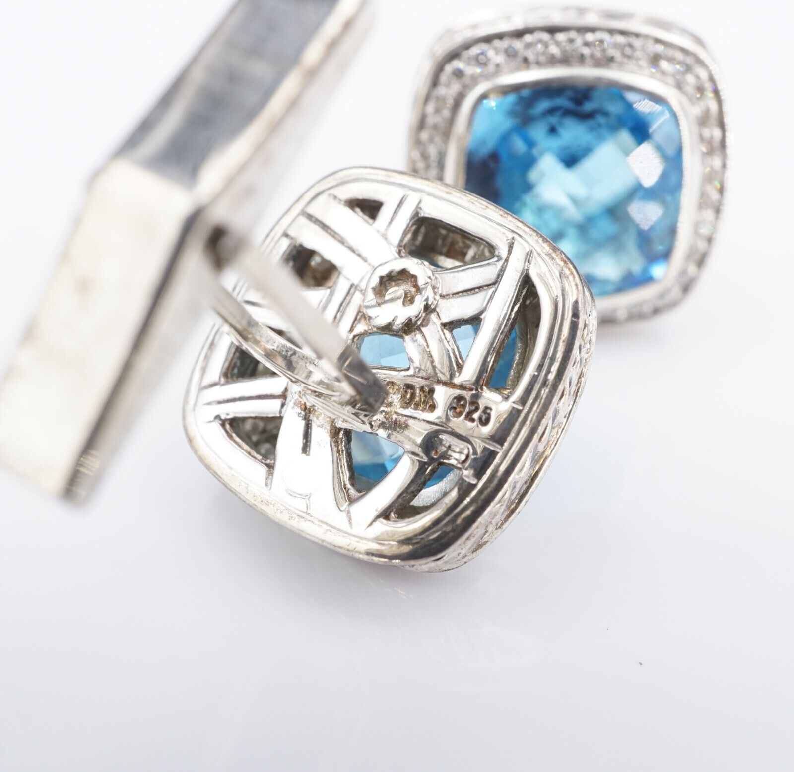These retired David Yurman Albion cufflinks feature a vivid blue cushion cut topaz bezel-set in a sterling silver frame with white diamonds decorating the border. The perfect piece to add to your Yurman collection!