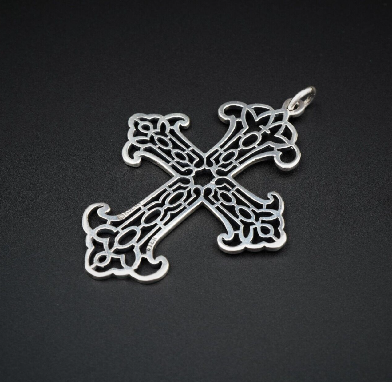 This retired James Avery pendant features a polished sterling cross with a delicately curved ornate open work design. The flared ends give this pendant an iconic fleuree style feel. An elegant and timeless piece, crafted in solid sterling silver.
