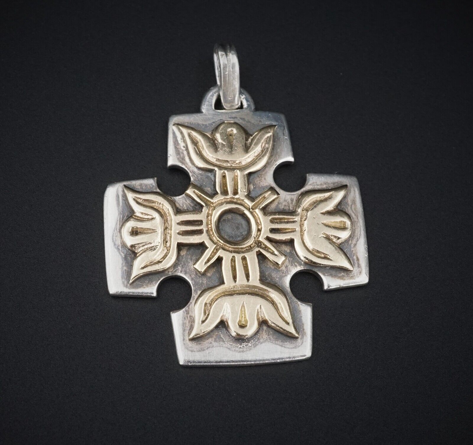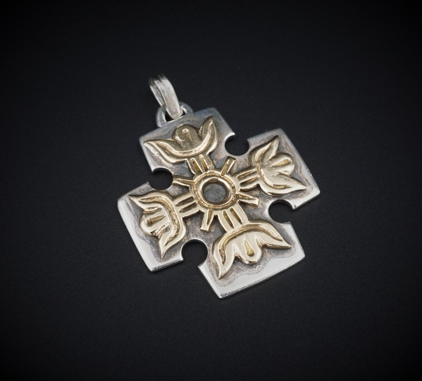 This rare retired James Avery pendant features a sterling silver cross with a raised 14k yellow gold floral pattern and a halo at the center. An meaningful and timeless piece, great for a James Avery collector.