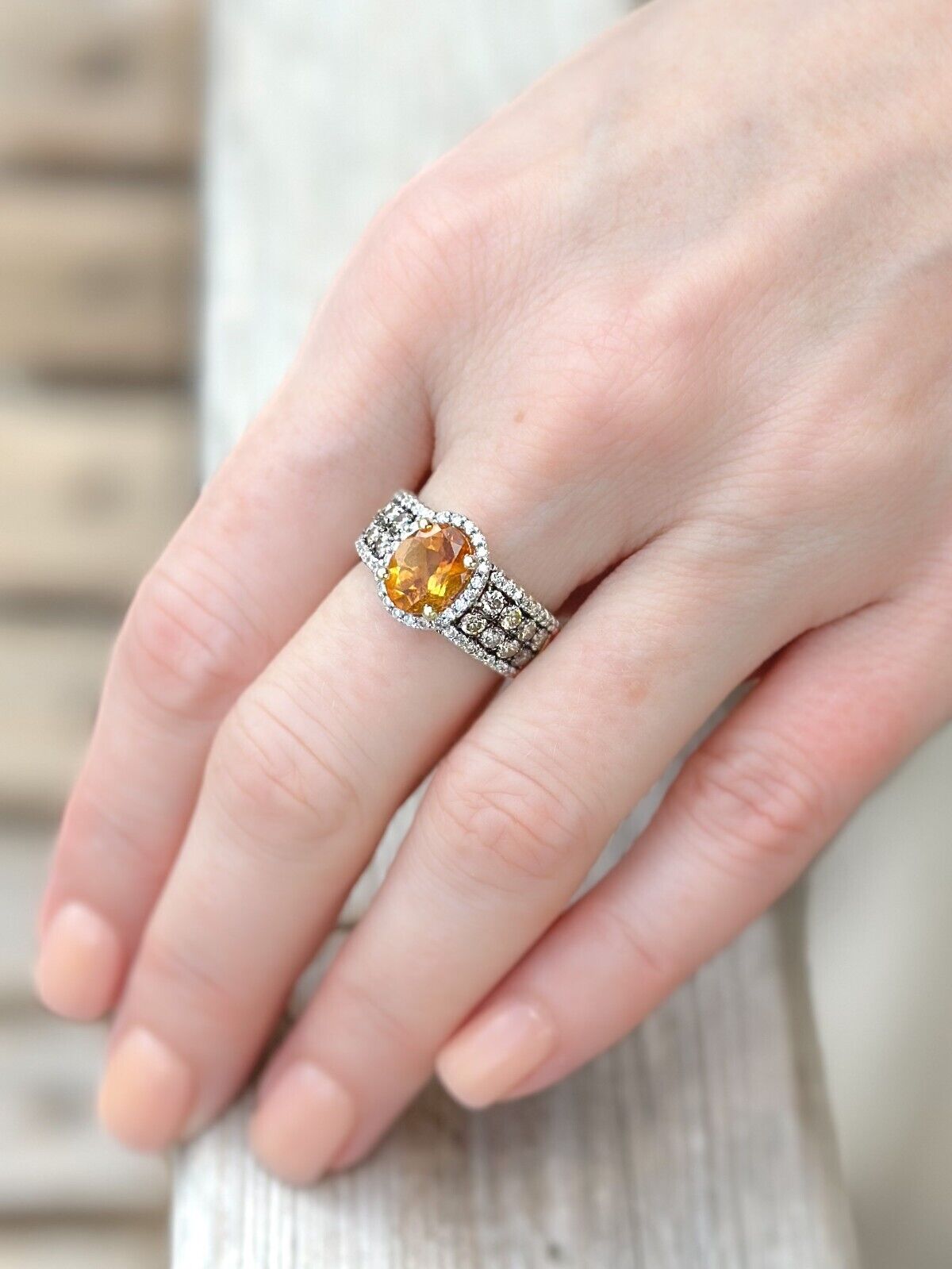 This eye-catching ring from Le Vian features a warm orange citrine at its center with a "vanilla" diamond halo. Sparkling champagne and vanilla diamonds cascade down the shoulders of the ring. This ring will make a gorgeous and unique engagement ring, right-hand ring, or anniversary gift!
