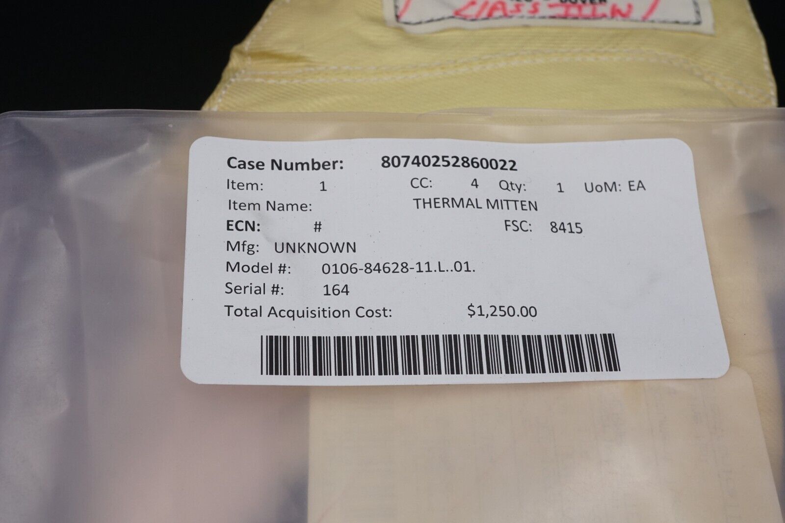 Documented as: THERMAL MITTEN NAME: THERMAL MITTEN, SERIAL NMBR: 164, WRHS LOC:FV A16, UNKNOWN 0106-84628-11[L][01] 01068462811L01