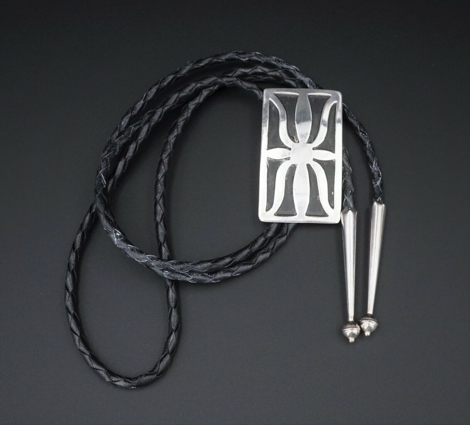 This handsome bolo tie features a beautiful solid sterling silver bolo with a Navajo overlay Ketoh design on a 38" braided leather cord with sterling silver tips. The black background and sharp contrast gives the design great depth and character. This bolo is a fun accessory -- perfect to dress up a button-down shirt with true Native American style!