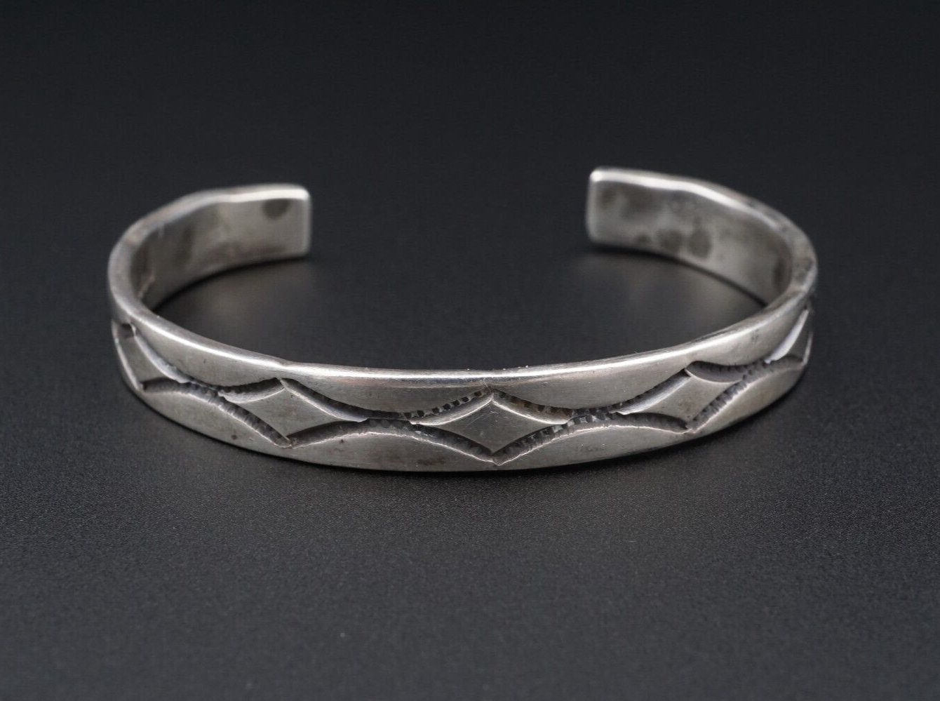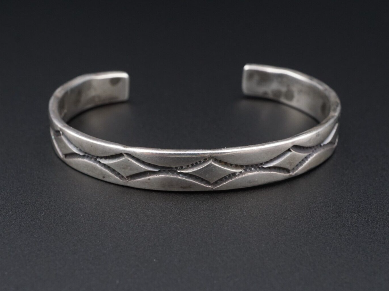 This beautiful cuff bracelet features a hand stamped sleek pattern all crafted in solid sterling silver. This lovely statement piece will be a great addition for any collector of Native American jewelry.