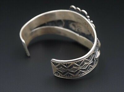 This lovely cuff bracelet features a beautiful natural Kingman turquoise cabochon set in a unique geometric bezel set atop a scalloped band. Hand-stamped detailing and oxidized accents grace the face of the sterling silver cuff. This one-of-a-kind statement piece will be a great addition for any collector of handmade Native American jewelry.