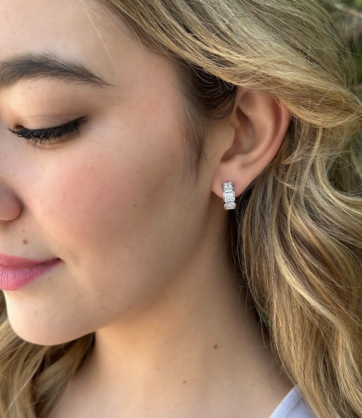 This beautiful pair of Penny Preville huggie hoop earrings are crafted of solid 18k white gold with diamond stations, creating a elegant look. Earrings can be reversed for an everyday look. Retired style.