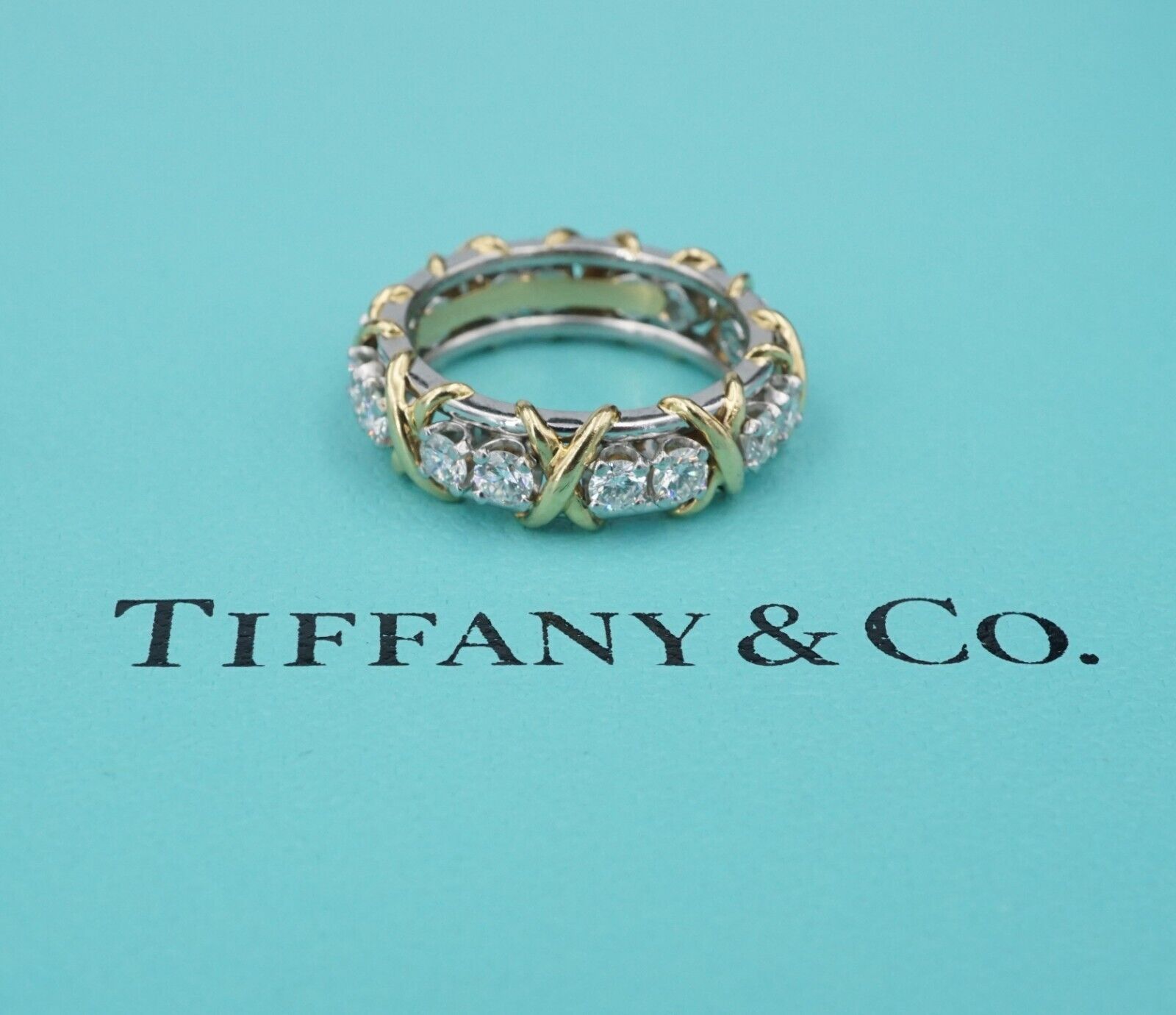 This lovely Tiffany & Co. ring features a classic platinum and yellow gold eternity design with diamonds set around the entire band.