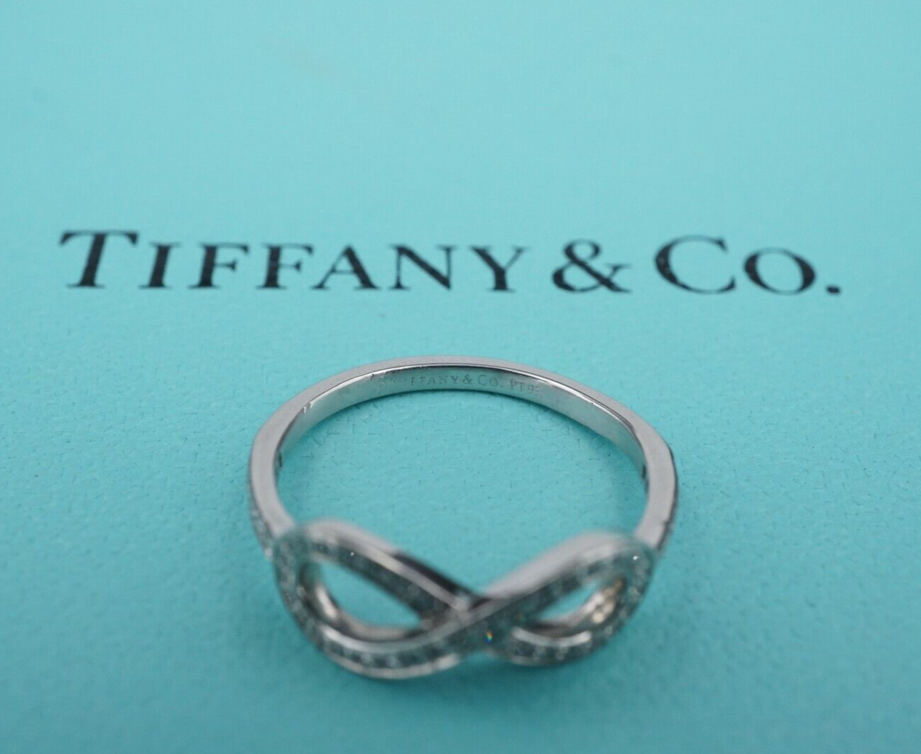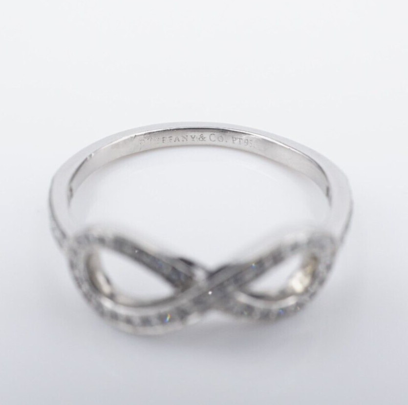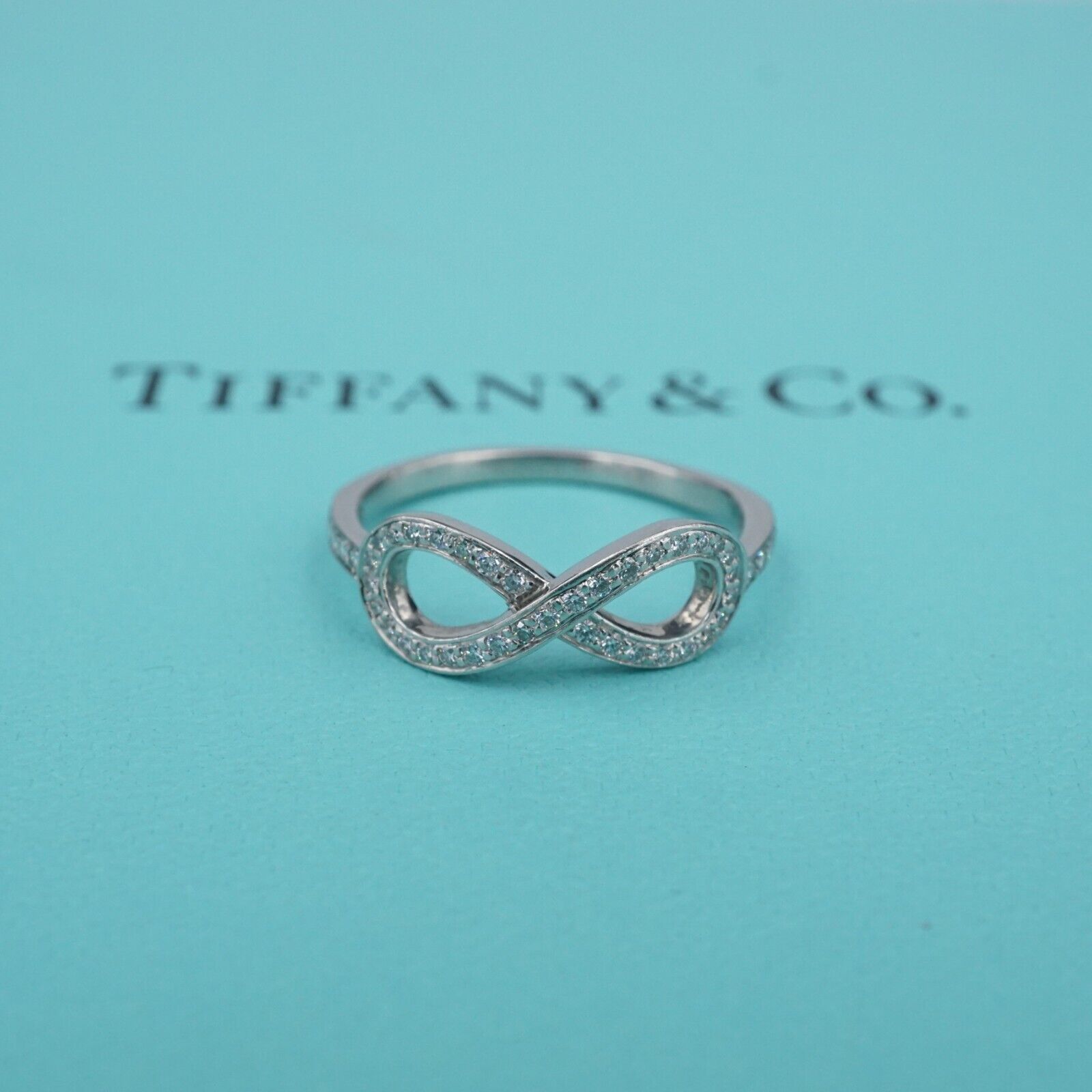 This classic Tiffany & Co. ring features an infinity symbol decorated with diamonds in a classic platinum design with diamond accents on each shoulder. A stunning piece to add to your Tiffany collection!