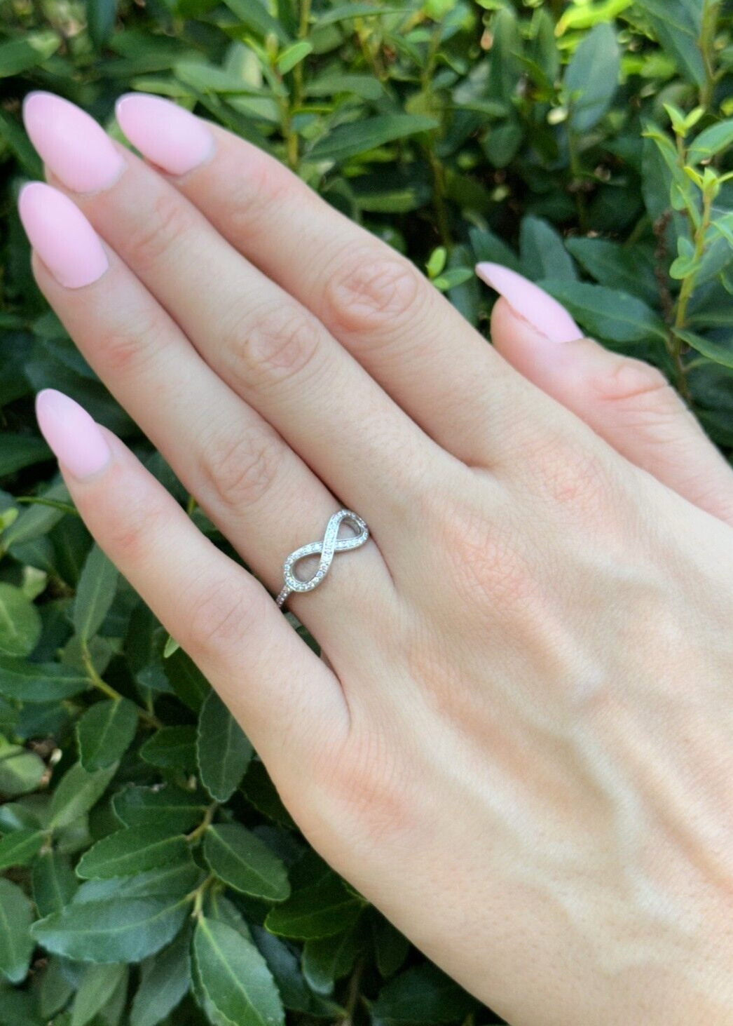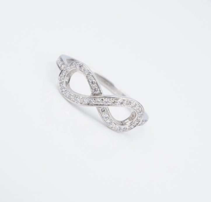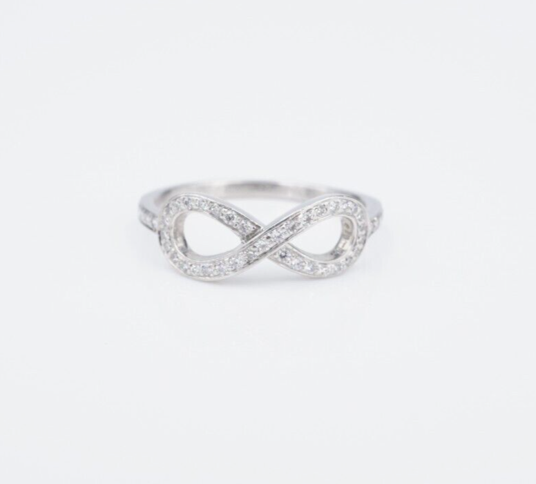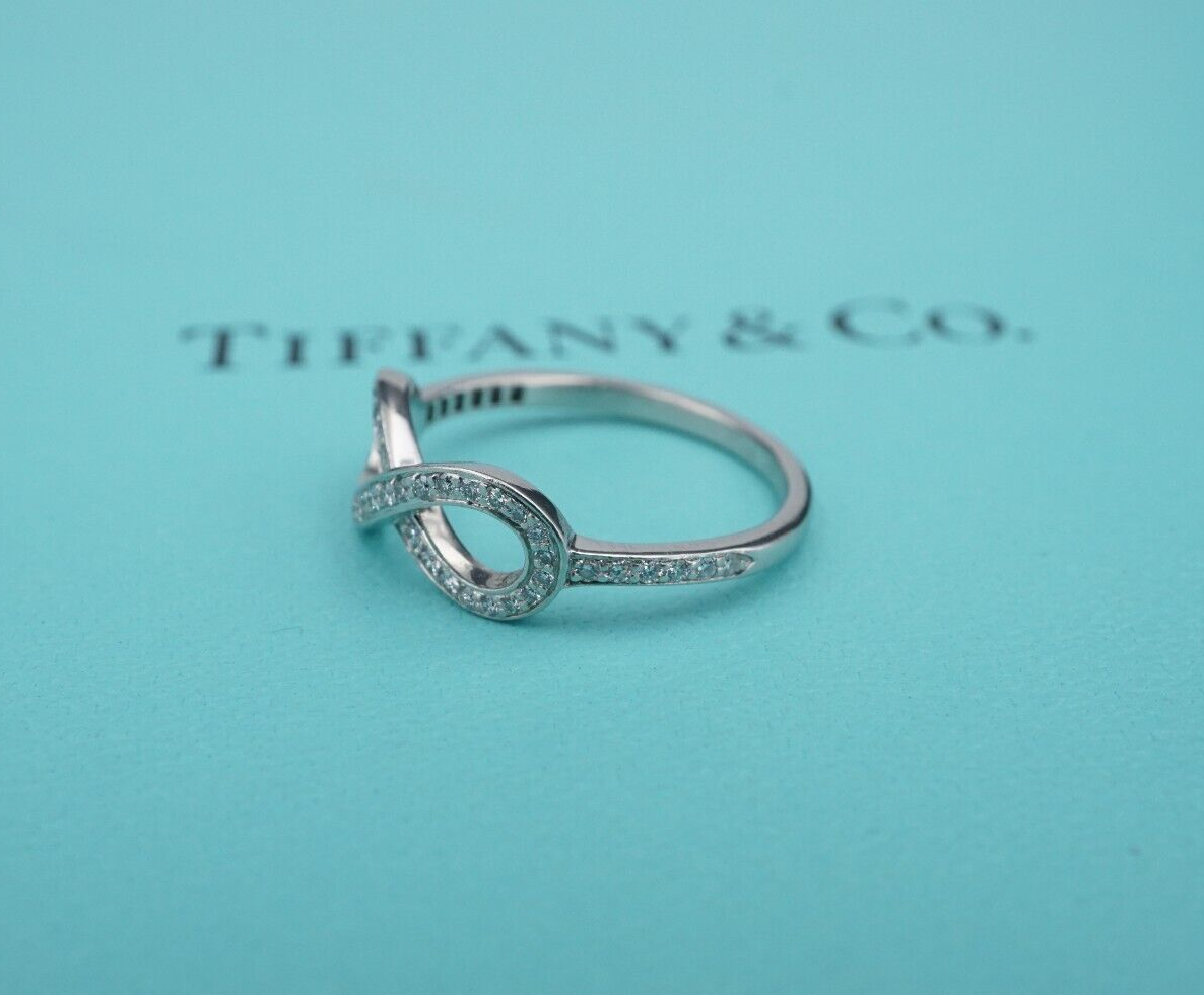 This classic Tiffany & Co. ring features an infinity symbol decorated with diamonds in a classic platinum design with diamond accents on each shoulder. A stunning piece to add to your Tiffany collection!