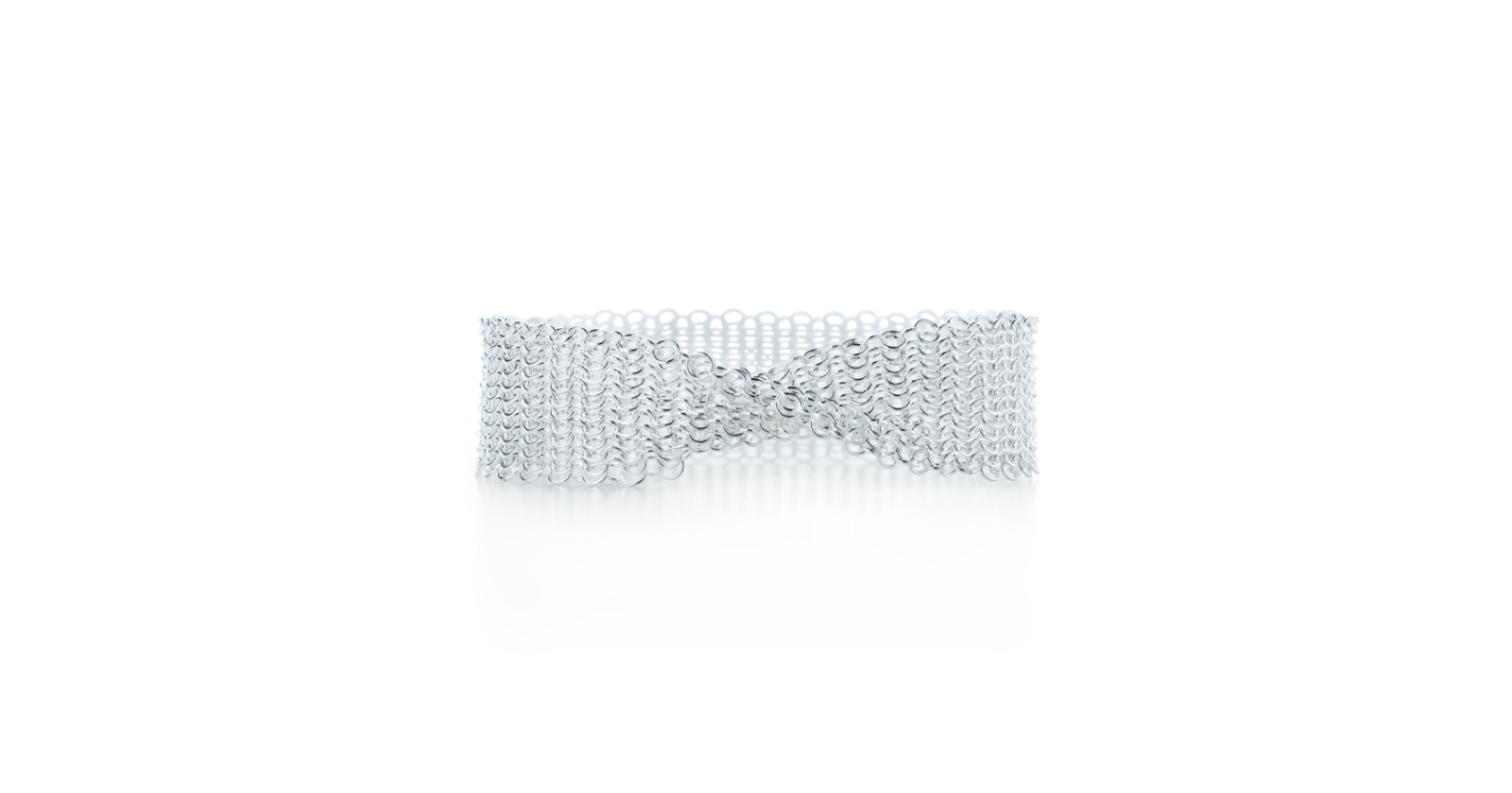 This Tiffany & Co. mesh bracelet is crafted from solid sterling silver interlocking links. The form is malleable and ergonomic in the way it drapes and contours to the wrist. With a continuous design and a 1/2 twist to the construction, this beautiful bracelet is iconic. Original designs copyrighted by the Nando and Elsa Peretti Foundation.