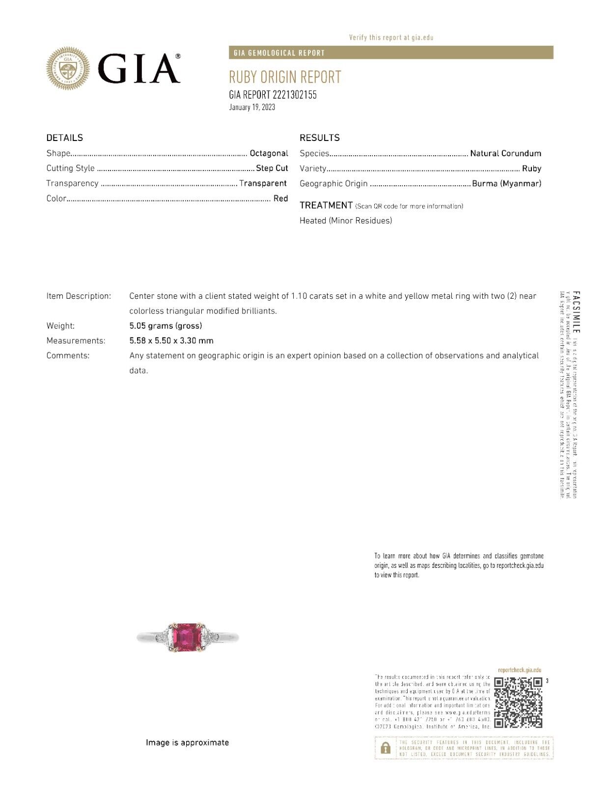 Measurements: Size 7; Ruby: 5.5 mm= approx. 1.1 carats; GIA certified Burma origin - see attached cert.; Diamonds: 2 accents = approx. 0.5 carats; Total gemstone weight: approx. 1.6 carats