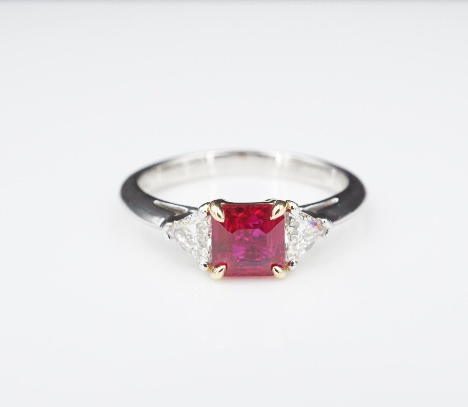 This beautiful ring features a natural square cut Burma ruby, flanked by sparkling trillion cut diamonds creating an elegant design. The gemstones are set in 18k yellow gold on top of a polished platinum band. Perfect as an alternative engagement ring, anniversary ring, or stunning right-hand cocktail ring!