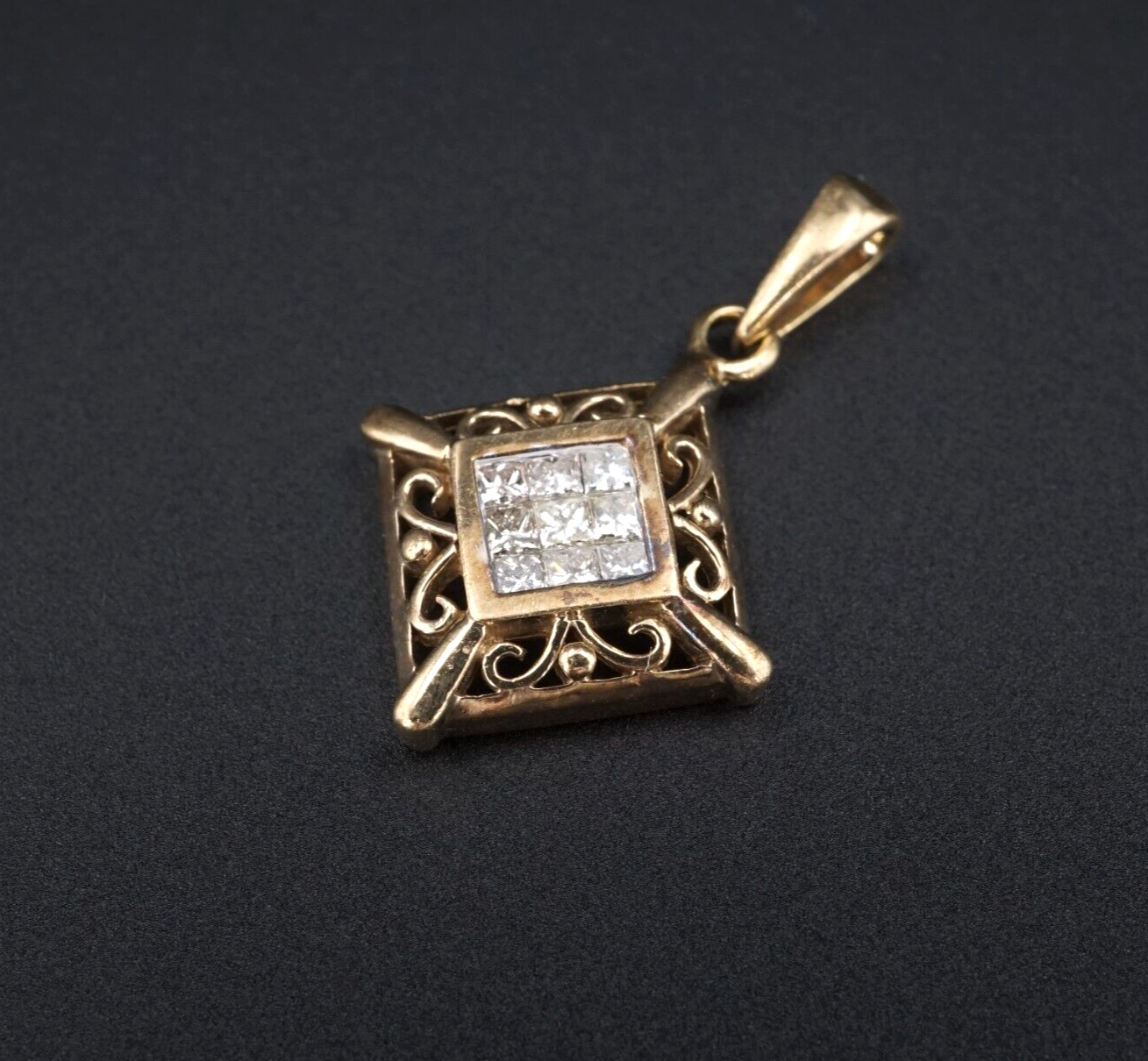 This beautiful diamond pendant features 9 princess cut diamonds, invisible set in an 10k yellow gold square frame with swirl cutouts. A great gift with brilliant sparkle!