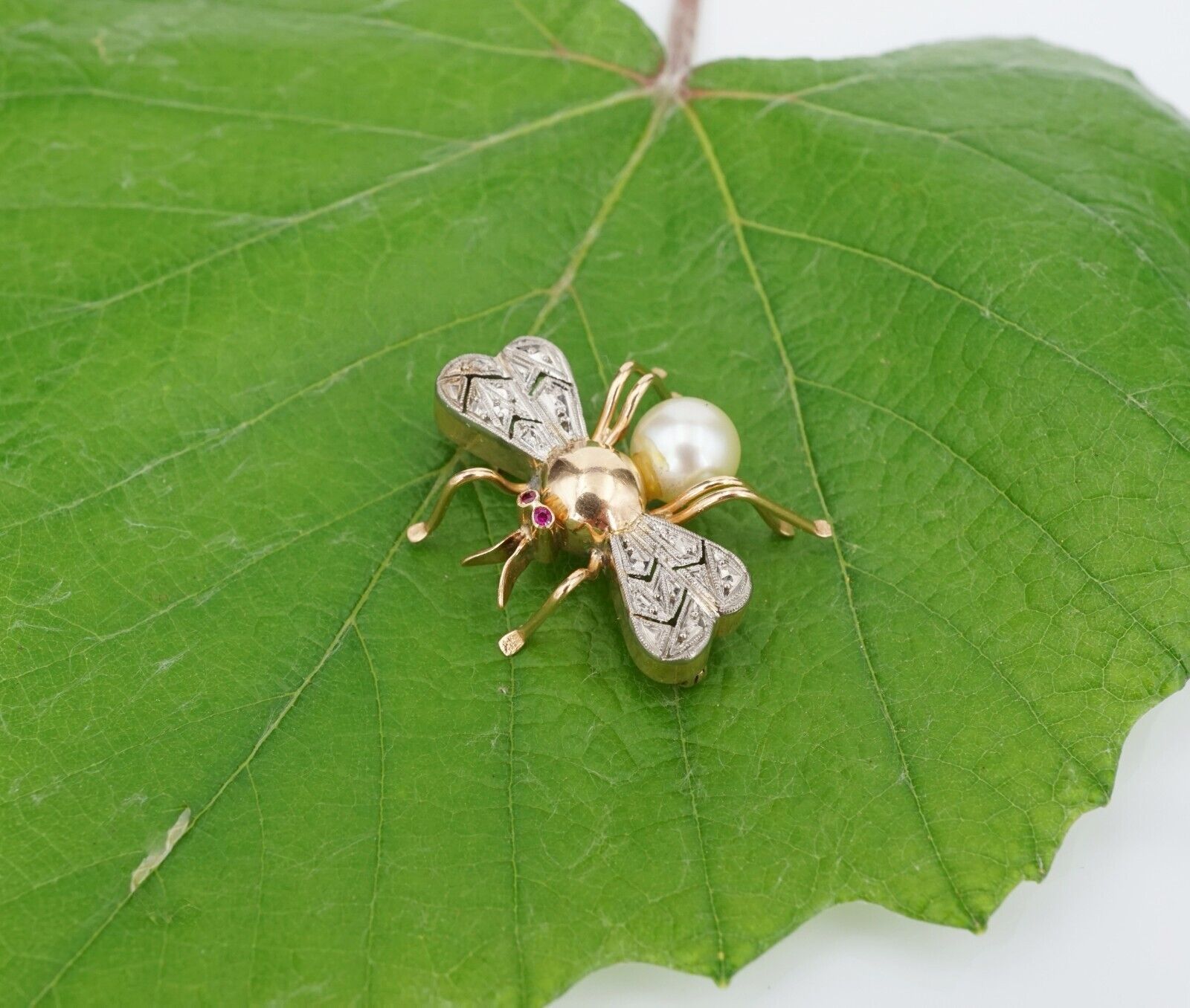 Vintage 18k Gold Bug Pin Brooch Pearl Ruby Eye 3D Fly Moth 2-Tone 1" M1497