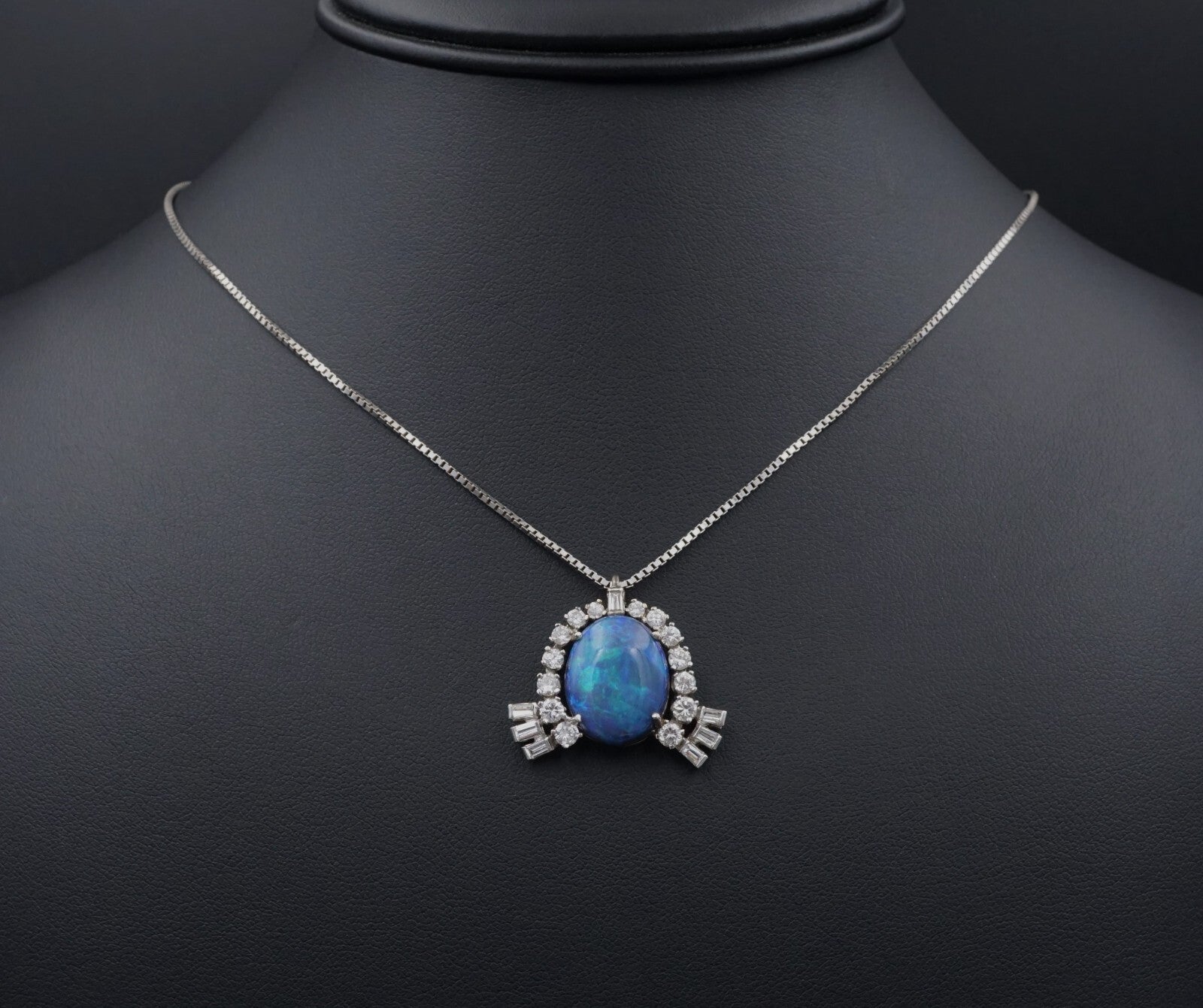 This beautiful necklace features an black opal cabochon surrounded by a semi-circle of sparkling round cut diamonds set in solid 18k white gold. Diamond baguettes accent the crown and base of the pendant, perfectly framing the vivid blues and greens of the stone! Suspended from a solid 14k white gold box chain, this necklace is the perfect piece for any collection!