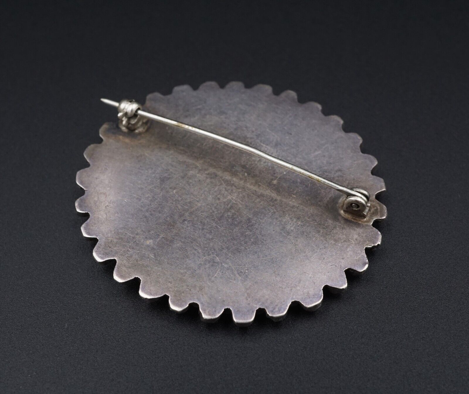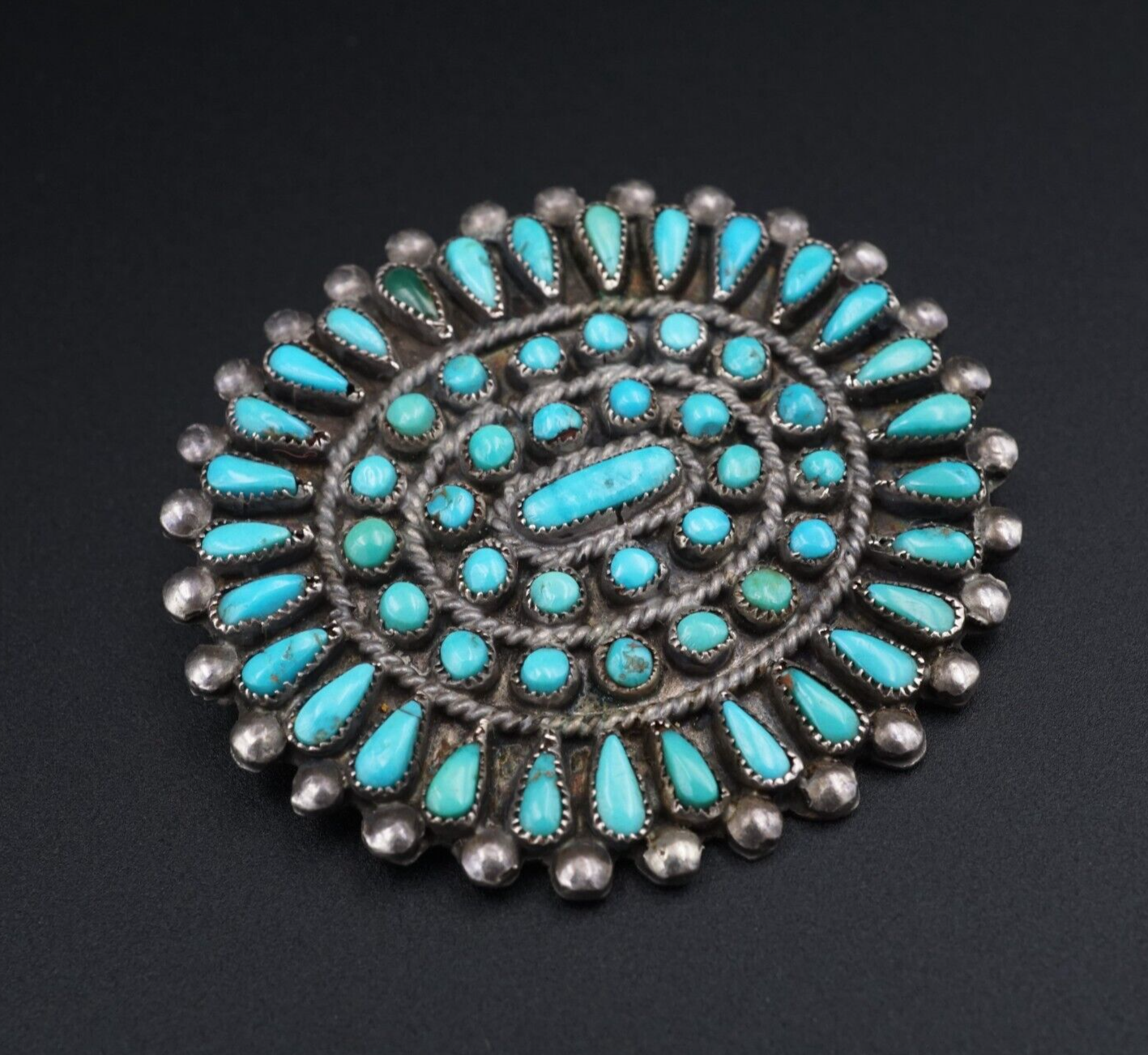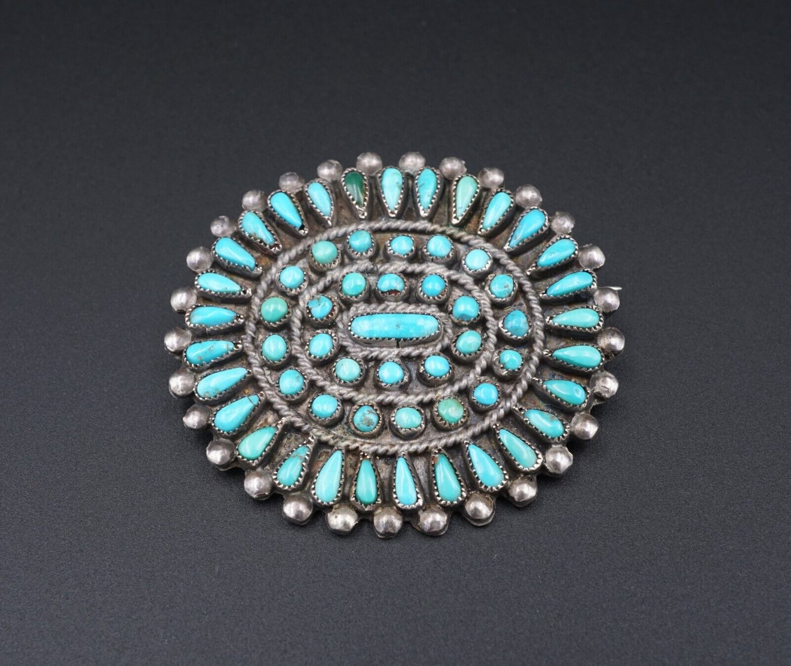 Vintage Zuni Turquoise Petit Point Brooch Sterling Silver Hand Signed 1.8” OS638