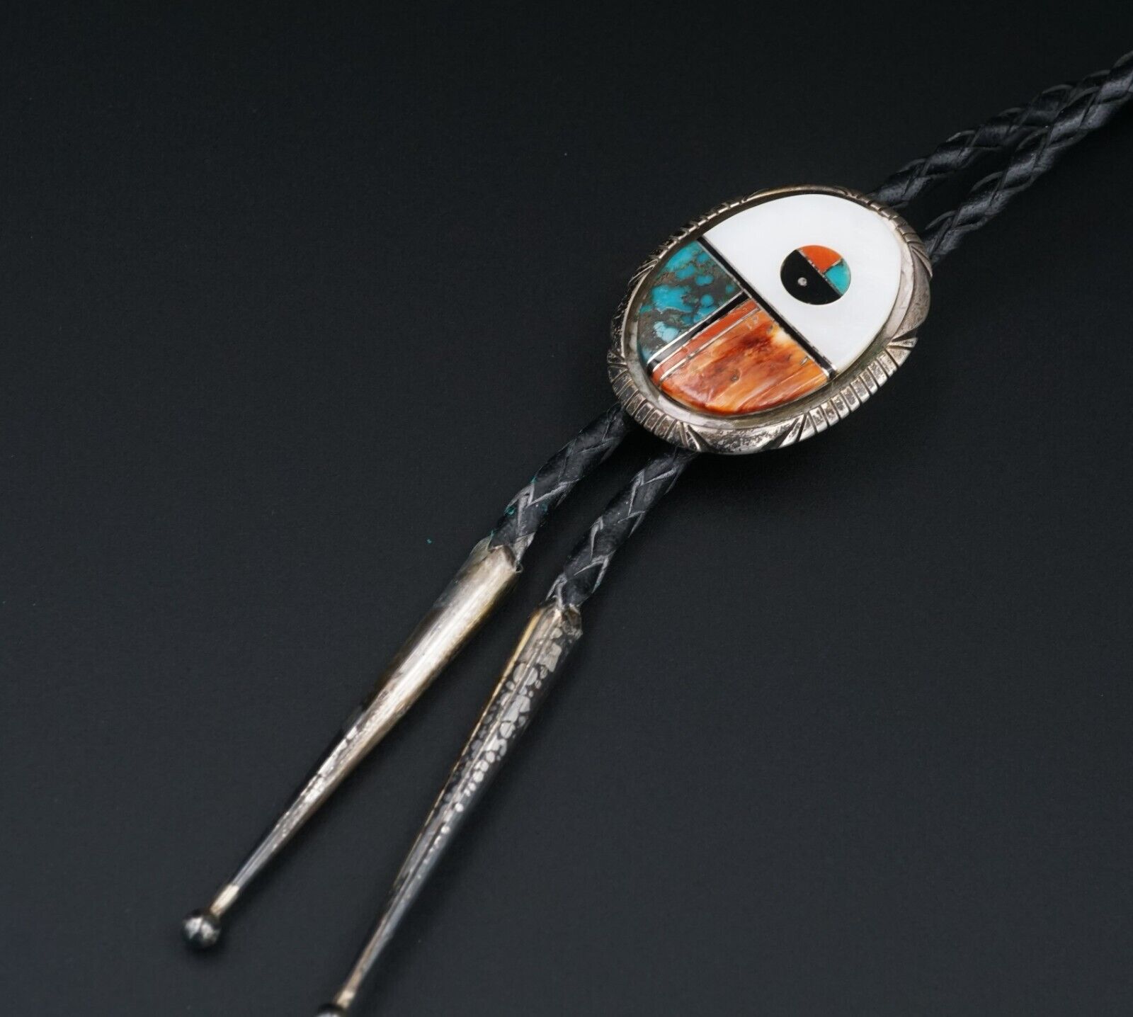 This handsome vintage piece features a beautiful solid sterling silver bolo with a Zuni inlay design crafted of mother of pearl, turquoise, onyx and shell. This bolo is a fun accessory -- perfect to dress up a button-down shirt with true Zuni style!